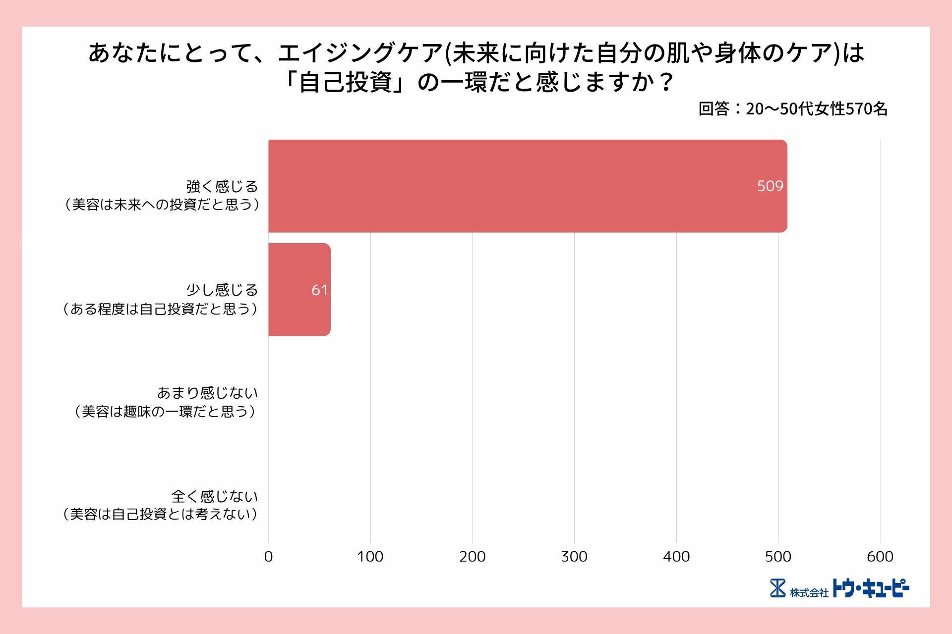 その結果、回答者全員(100%)が「エイジングケア=未来への自己投資」と捉えていることが判明しました。内訳では、「強く感じる(美容は未来への投資だと思う)」が89.3%と大多数を占め、「少し感じる(ある程度は自己投資だと思う)」も10.7%にのぼりました。