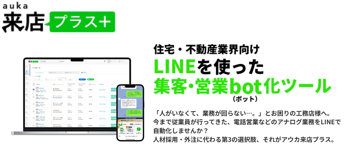 アウカ「来店プラス」は、LINEを使って新規顧客を増やしたい工務店様に最適な、住宅・不動産業界向けの集客・営業bot化ツールです。LINEによる高い開封率と閲覧ログ機能でお客様の動向を見える化し、資料請求やイベント一括配信機能で来店を促します。