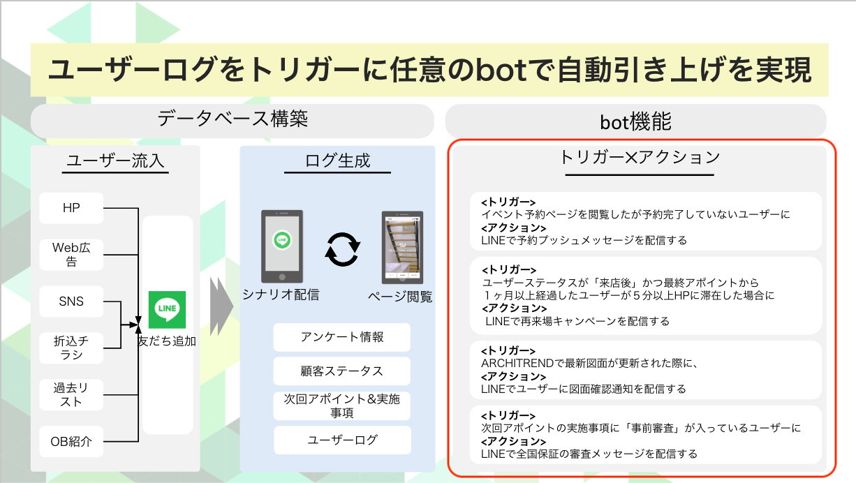 *トリガー:お客様の閲覧ログ(LINE開封・ホームページ閲覧等)を元にbot発動条件を指定します