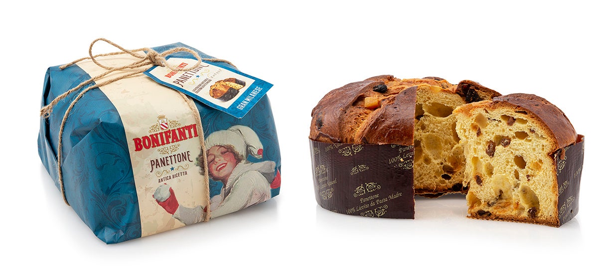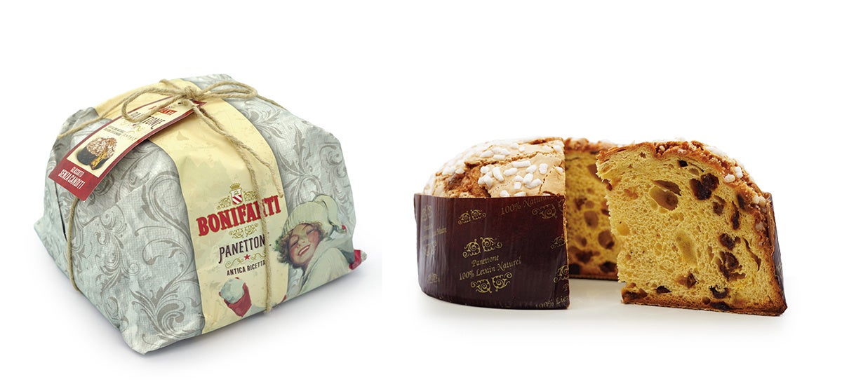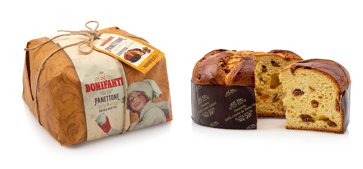 伝統的製法で作られたオリジナルの生地にサルタナレーズン、砂糖漬けのオレンジピールとシトロンピールがたっぷり入ったクラシックタイプのパネットーネ。香り高くしっとりとした生地はボニファンティならではのおいしさです。