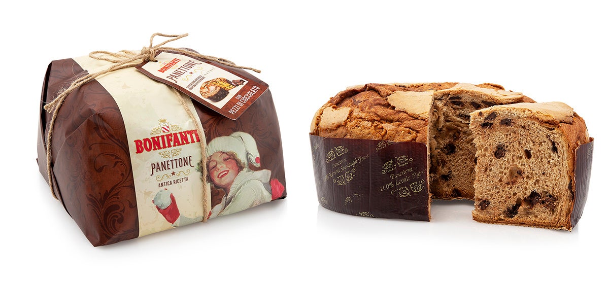 カカオの風味が感じられるダークチョコレートチップが散りばめられたパネットーネ。ボニファンティの独自製法によりしっとりと柔らかい生地のトップをヘーゼルナッツのアイシングでコーティングしています。