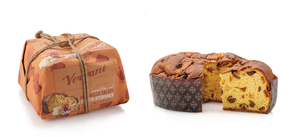 小麦粉、天然酵母、バター、新鮮な卵黄で作った伝統的なパネットーネ生地に、ホワイトチョコレートチップとソルティキャラメルを加えた豊かな味わいのパネットーネ。