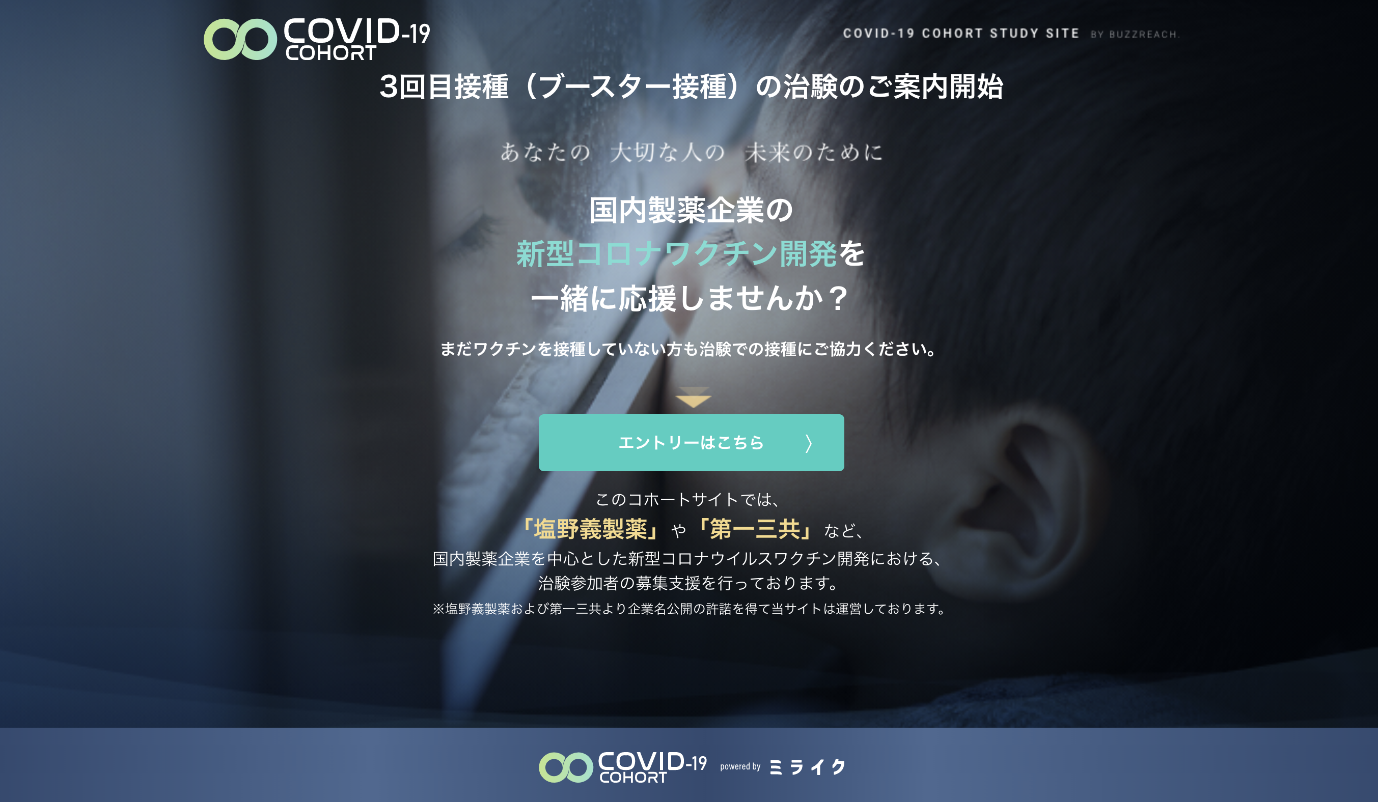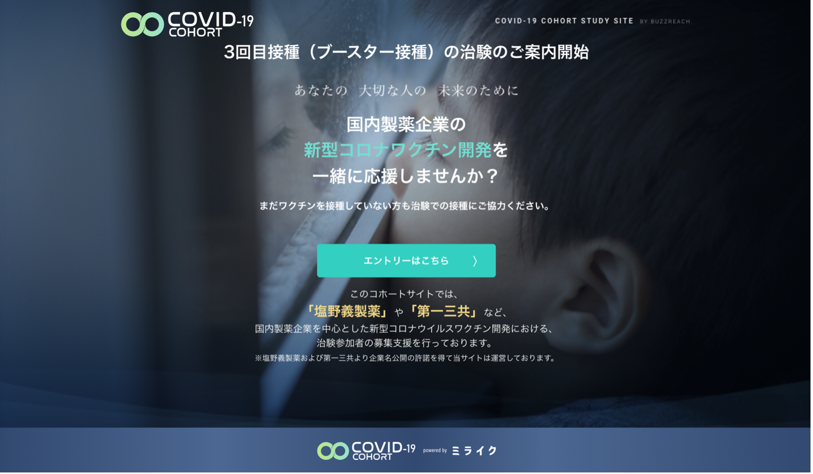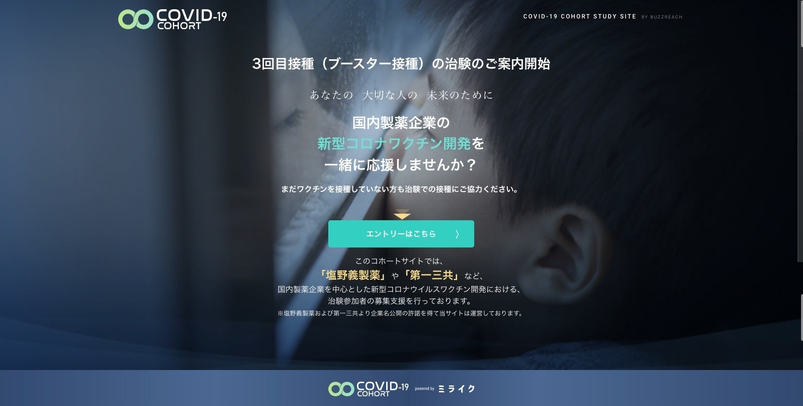 製薬企業と患者をつなぐ治験支援クラウドサービスおよび、治験情報公開インフラ、患者特化型SNSミライク、副反応/副作用情報収集アプリVOICEなどを展開している株式会社Buzzreach(本社:東京都品川区、代表取締役CEO:猪川 崇輝、以下Buzzreach)は、2021年7月からスタートした国内製薬企業による新型コロナウイルス(COVID-19)ワクチンの開発を応援するための『新型コロナウイルス国内製薬企業ワクチン応援バンク』において、ワクチン未接種者対象やブースター接種型の治験における募集を開始したことをお知らせします。