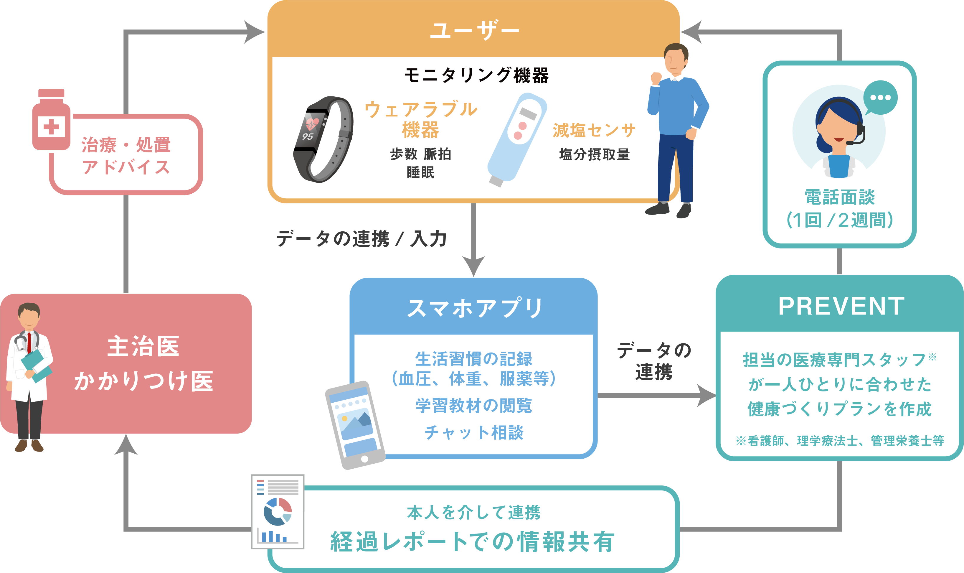 専属の医療専門職が、生活習慣の客観的評価やヒアリングを行い、一人ひとりに合わせた最適な健康づくりプランを提案し、生活習慣改善を6カ月間サポートします。プログラムの参加者は、スマートフォンアプリを介して日々の血圧、体重、身体活動量や塩分摂取量など数値化します。モニタリング結果は、専属の医療専門職に共有され、2週間に一度の電話面談やチャットを介して行動変容に関するサポートを受けます。プログラムの取り組みの様子はレポートを介して主治医と連携され、医療機関との連携のもとプログラムは提供されます。
