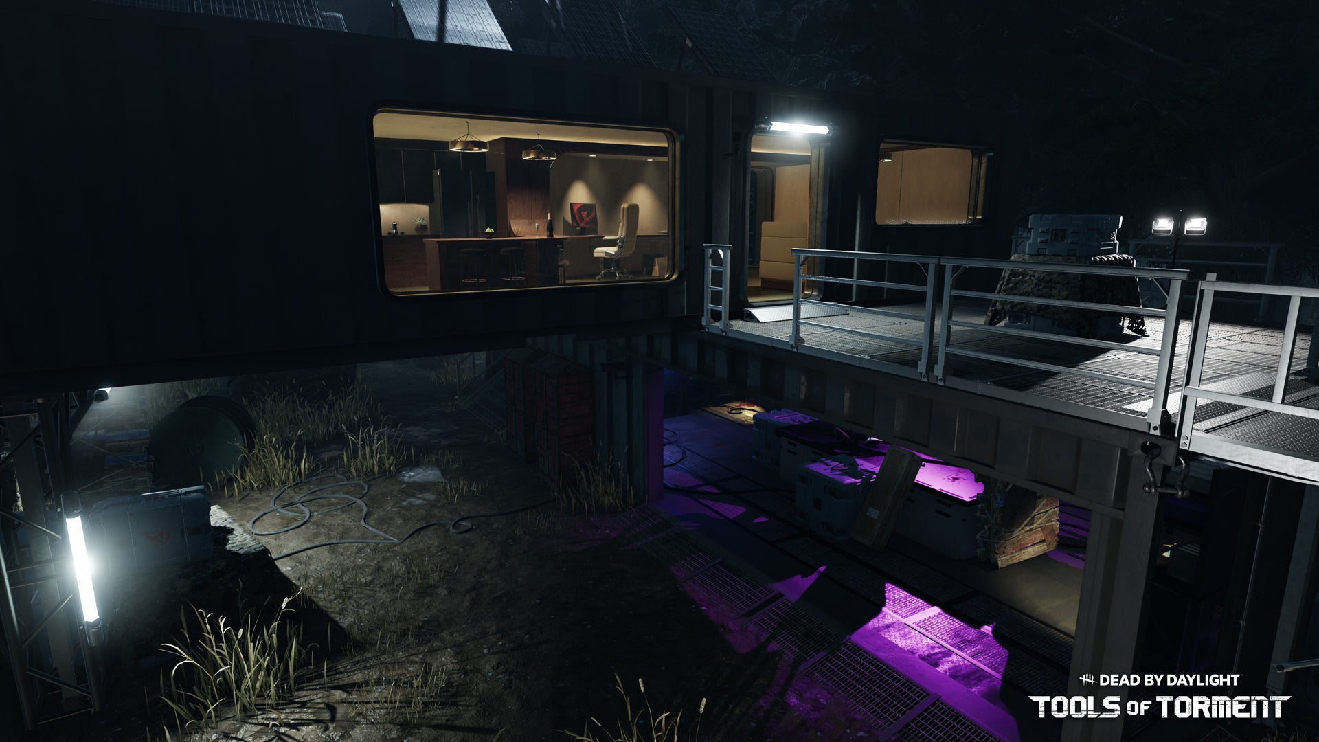 新チャプターでは既存マップの「Shelter Woods(シェルター・ウッズ)」に「The Skull Merchant’s Hunting Camp(スカルマーチャントの狩猟拠点)」が追加されます。放棄された複数の輸送用コンテナが使われたこの狩猟拠点には、表と裏の顔を持つスカルマーチャント、アドリアナ・イマイの歪んだ世界がそのまま反映されています。上部のコンテナは彼女のエグゼクティブ・スイートとなっており、清潔で豪華な内装に高価なインテリアが備わっています。一方で下に広がるのは薄暗い作業スペースで、油や血にまみれながらスカルマーチャントがこの場所で道具いじりを行う場所であり、恐ろしい戦利品が多く保管されています。