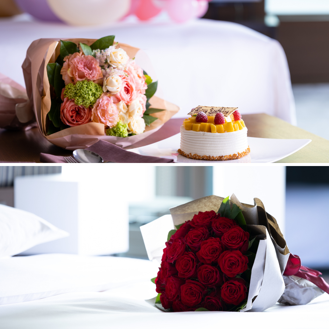 また、有料オプションにて花束(3,500円~税別)やバルーン(10,000円~税別)など特別なサプライズの演出もお手伝いさせていただきます。ご希望の方はご到着の5日前までにコンシェルジュまでお気軽にご相談ください。