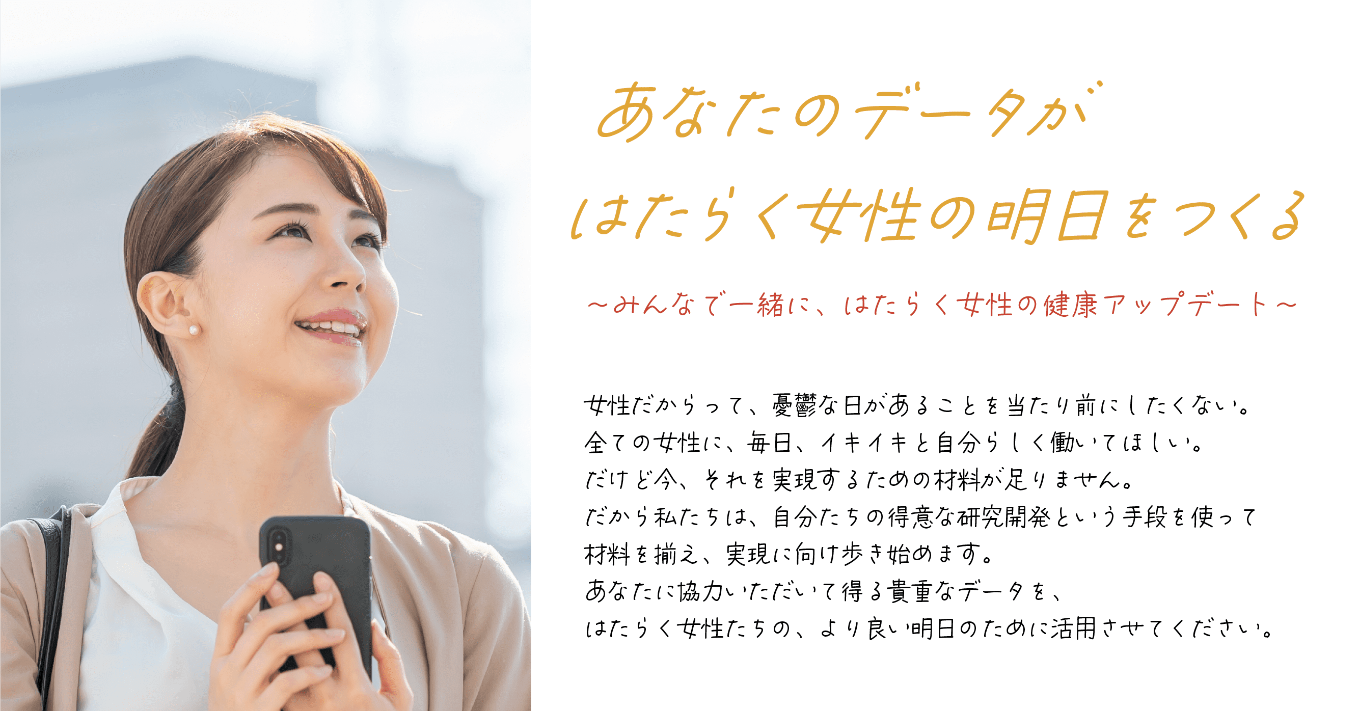 それを実現するために、私たちが得意とする研究開発を軸として、現状世界的に不足している女性に特化した研究データの蓄積や、それらの社会実装を行い、働く女性一人一人に寄り添えるような、さまざまな解決策を提供するために本プロジェクトを発足しました。