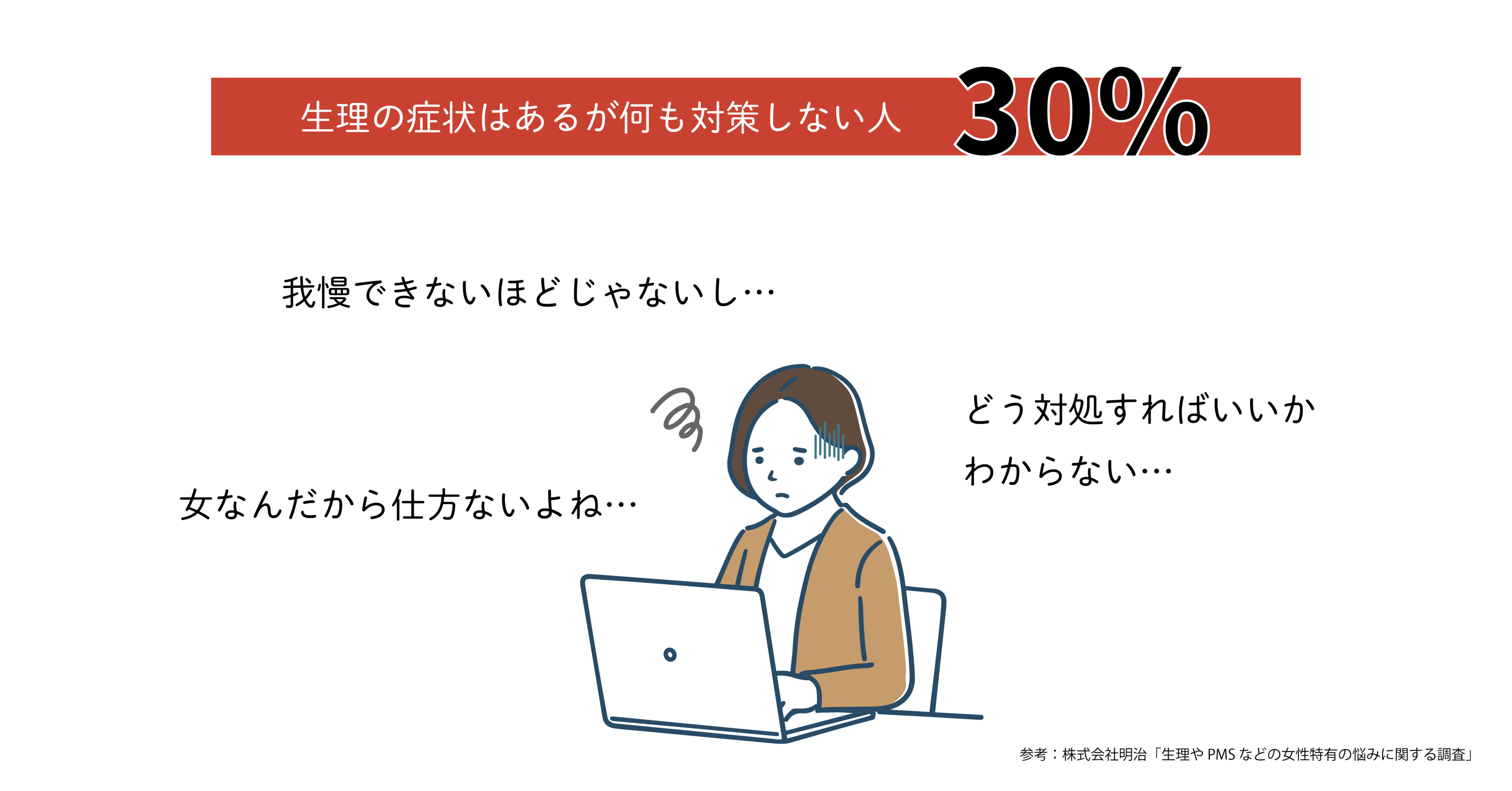 しかしながら、生理の症状に対して根本的な解決に取り組む人は少なく、30%の人は対策方法がわからないなどの理由で、ただ我慢をして生理期間を乗り越えているというアンケート結果もあります。(※)