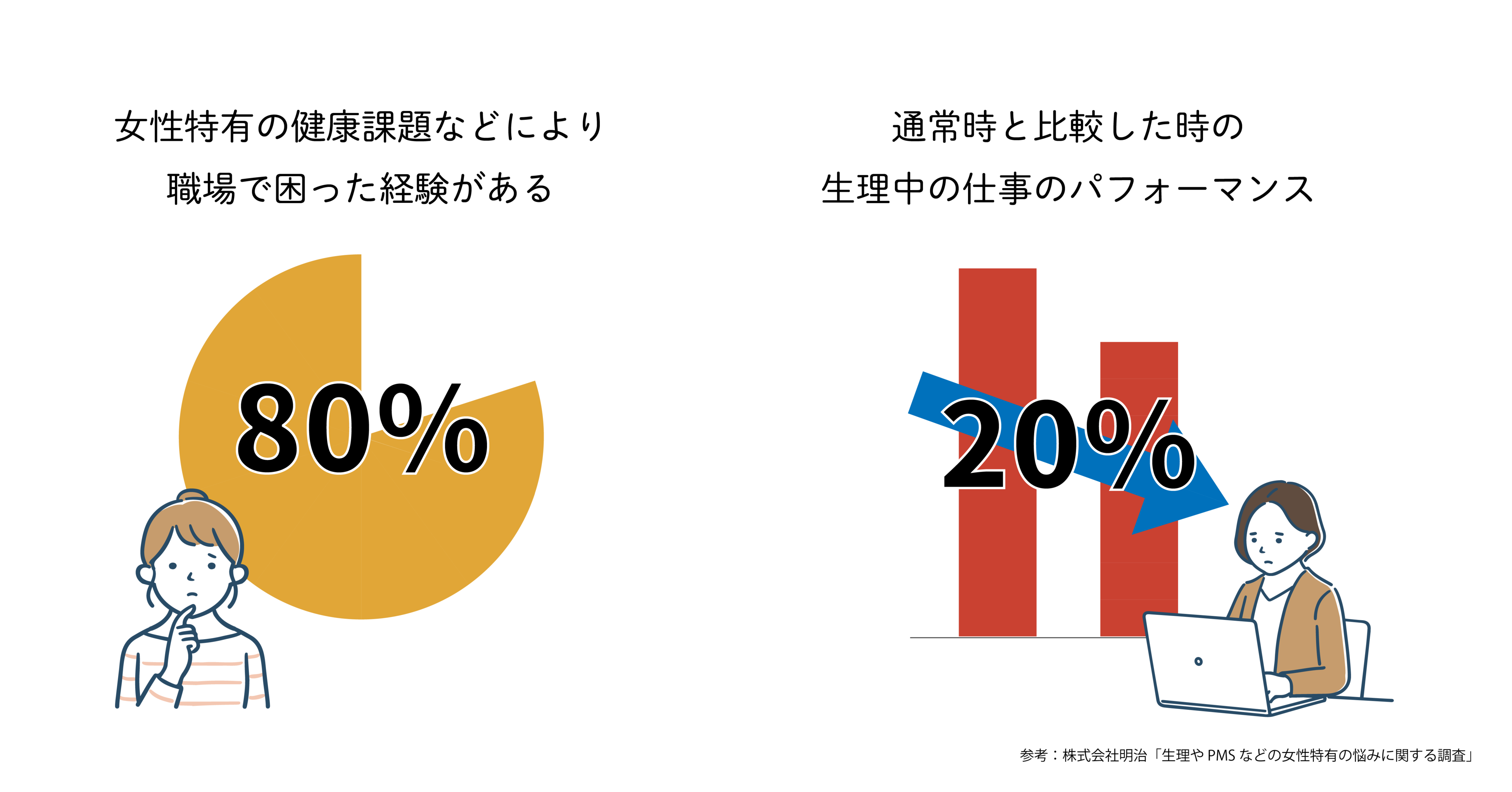 昨今行われた調査では、企業に勤める女性従業員の約80%が、「女性特有の健康課題などにより職場で困った経験がある」と感じており、例えば生理中における仕事のパフォーマンスは、通常時に比べ20%程度ダウンするということがわかっています。(※)