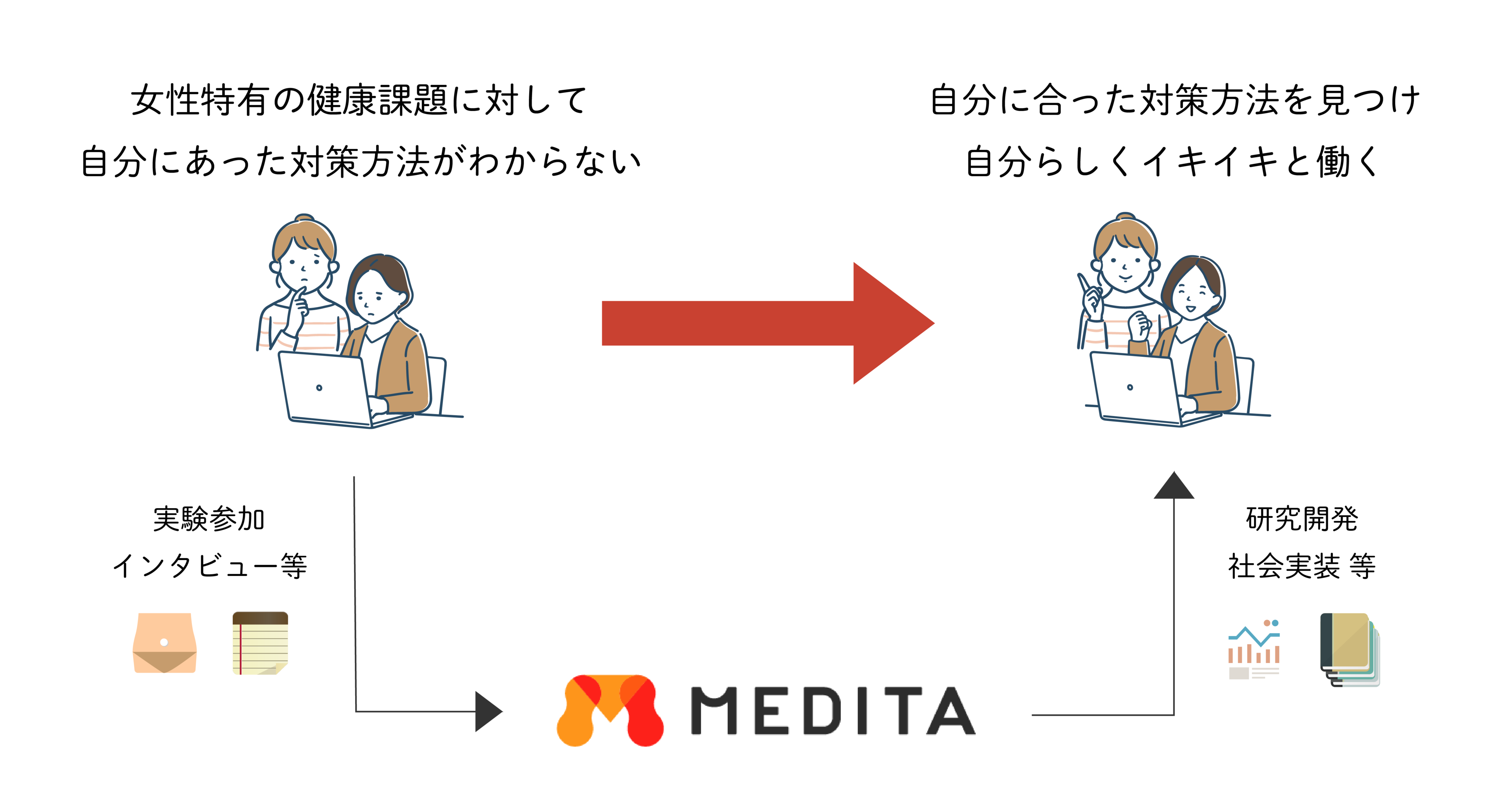 このような状況から、MEDITAでは働く女性が自分に合った対策方法を見つけ、女性特有の健康課題に対して、根本的な解決を行う必要があると考えています。