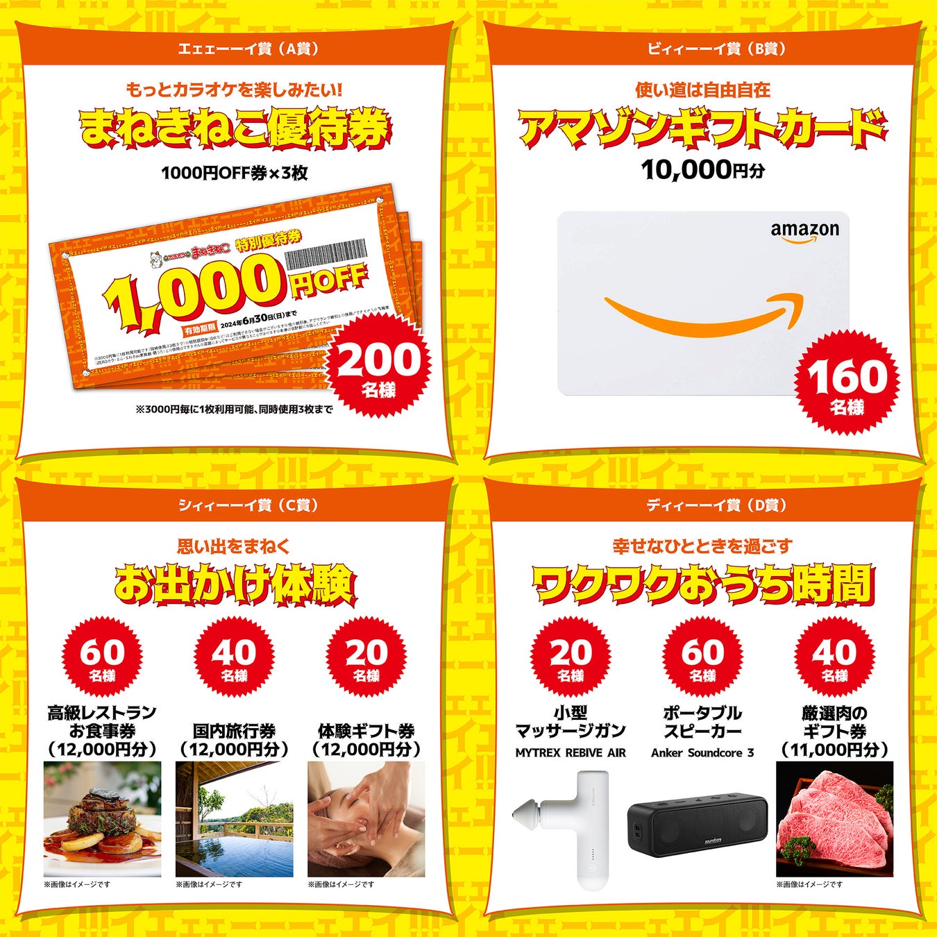 「にゃんこ大抽選会」は、対象となる全国の「カラオケまねきねこ」へご来店していただき、店舗内に設置されているQRコードから特設キャンペーンサイトを通して応募が可能です。応募いただいた中から抽選で、600名様へ豪華賞品をプレゼント。豪華賞品は、まねきねこ優待券(1,000円OFF券×3枚 3,000円分)、アマゾンギフトカード(10,000円分)、高級レストランお食事券(12,000円分) 、国内旅行券(12,000円分)、体験ギフト券(12,000円分)、小型マッサージガン*、ポータブルスピーカー*、 厳選肉のギフト券(11,000円分)などもらって嬉しい賞品がたくさん揃っています。
