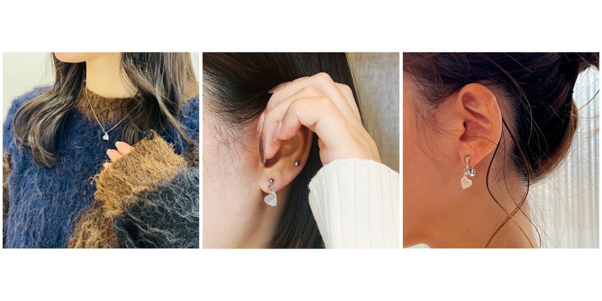 柔らかく落ち着いた風合いのハートフリット、明るくナチュラルな印象を与えてくれるハートクリアの2種類、動くたびにゆらゆらと揺れ動くネックレス・ピアス・イヤリングの各3アイテムを展開いたします。