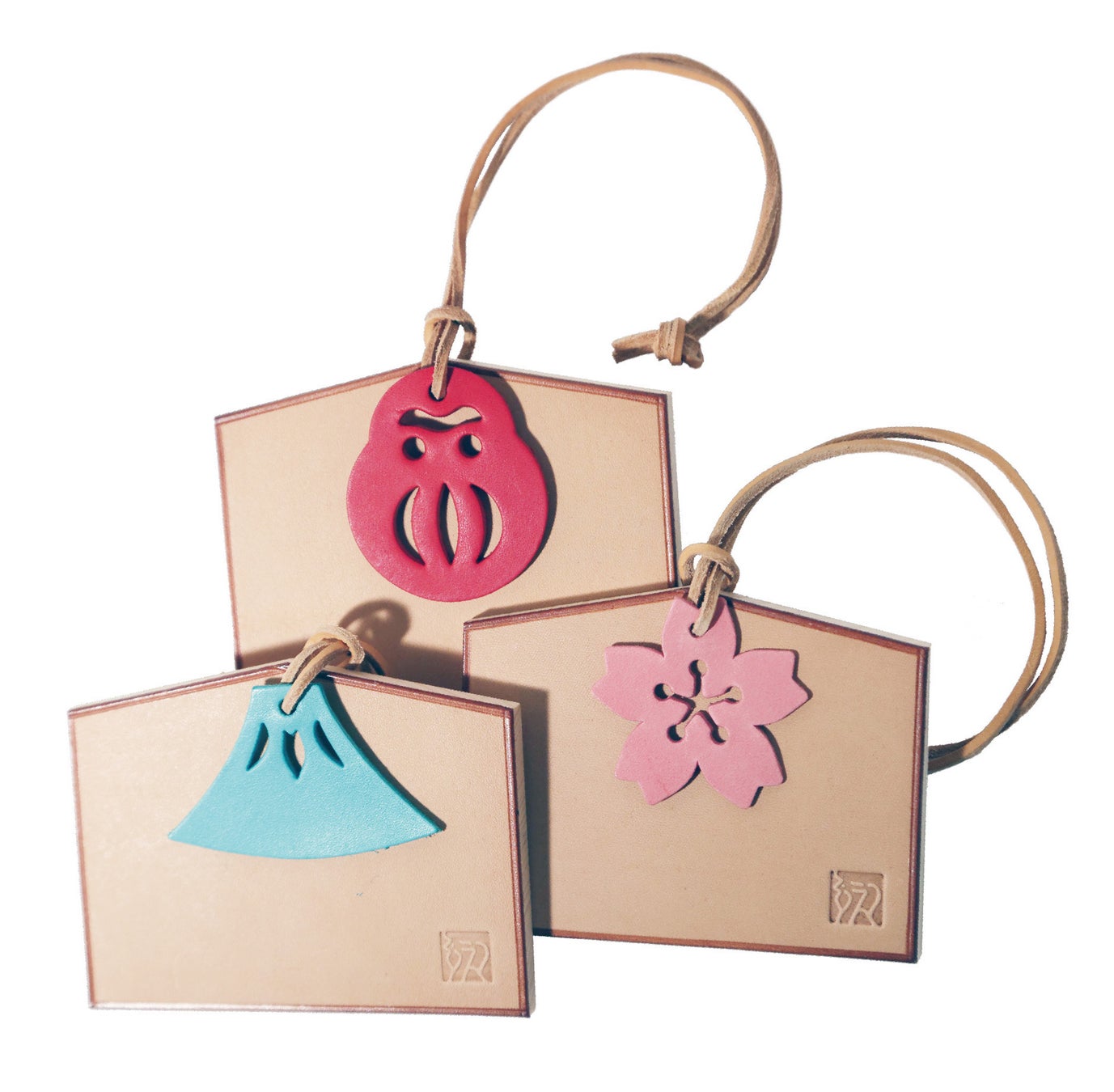 外国人旅行客にも大人気の絵馬をヌメ革と樅木で作り、東京・市谷八幡宮で満願成就の祈願を行いました。その絵馬に、レザーの面には電熱ペンで好きな柄を描いていただき、裏面にはお願い事をお書きください。絵馬には、富士山、桜、だるま、茄子、的などの縁起物チャーム付き。