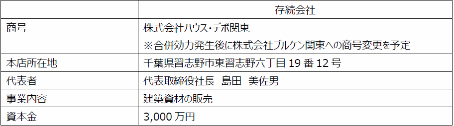 また、当社グループにおける総合建材小売事業セグメントのブランドイメージ形成を図ることを目的とし、合併後の存続会社商号を『株式会社ブルケン関東』へ変更いたします。