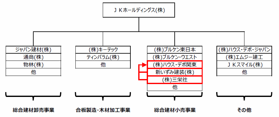 JKホールディングス株式会社(東京都江東区、代表取締役社長 青木慶一郎/以下、JKHD)の連結子会社である株式会社ハウス・デポ関東(千葉県習志野市、代表取締役社長 島田美佐男/以下、HD関東)は、同連結子会社である新いずみ建装株式会社(神奈川県横浜市、代表取締役社長 住吉渡/以下、新いずみ)および株式会社三栄社(神奈川県綾瀬市、代表取締役社長 住吉渡/以下、三栄社)を吸収合併する組織再編を行います。また、同日付で存続会社であるHD関東の商号を株式会社ブルケン関東(以下、BK関東)に変更いたしますので、お知らせいたします。