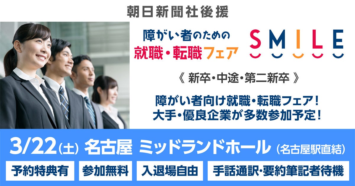 【愛知・名古屋】3/22(土)障がい者のための就職・転職フェアSMILE【2026新卒/2025新卒・第2新卒・中途対象】大手・優良企業が参加<朝日新聞社後援>無料キャリア相談コーナーあり