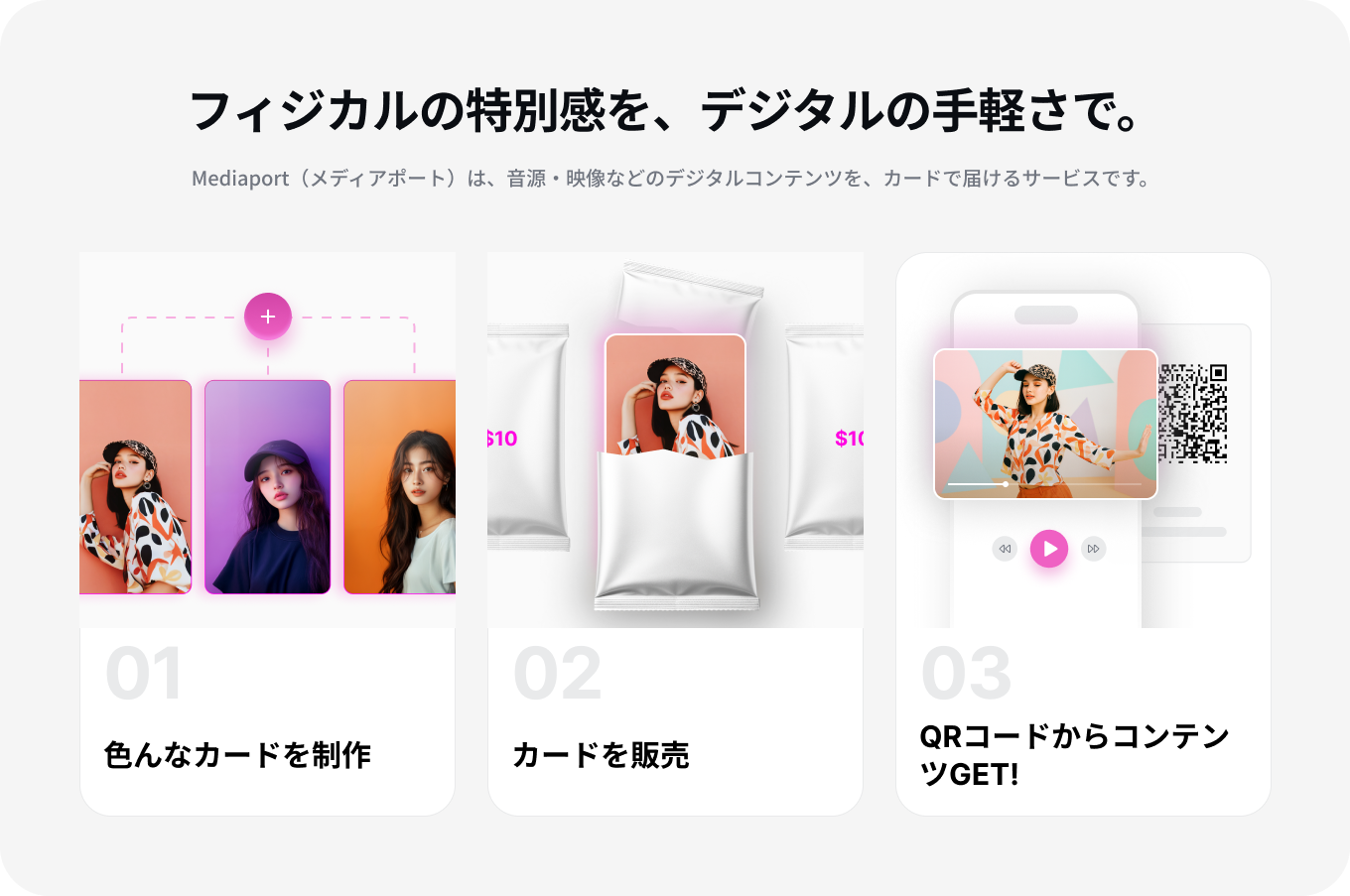 Mediaportは、「Small Card, BIG CONNECTION」をコンセプトに、音源・映像・写真などのデジタルコンテンツをQRコード付きのカードで届けるサービスです。
