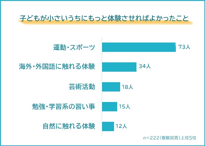 「子どもが小さいうちにもっと体験させればよかったこと」を聞いたところ、1位は「運動・スポーツ(73人)」でした。以下は2位「海外・外国語に触れる体験(34人)」、3位「芸術活動(18人)」となっています。
