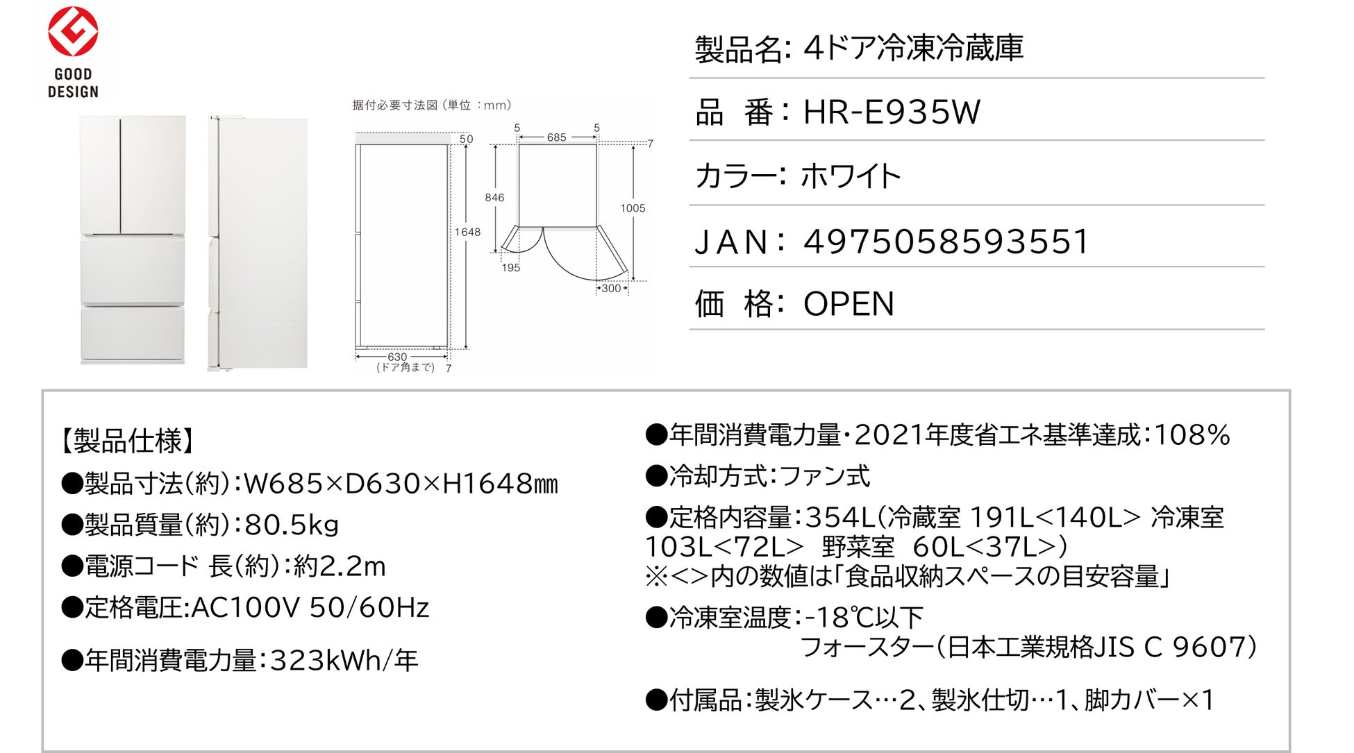 - 「感動シンプル」ライン 「背伸びせず使える冷蔵庫 HR-E935W」 製品詳細