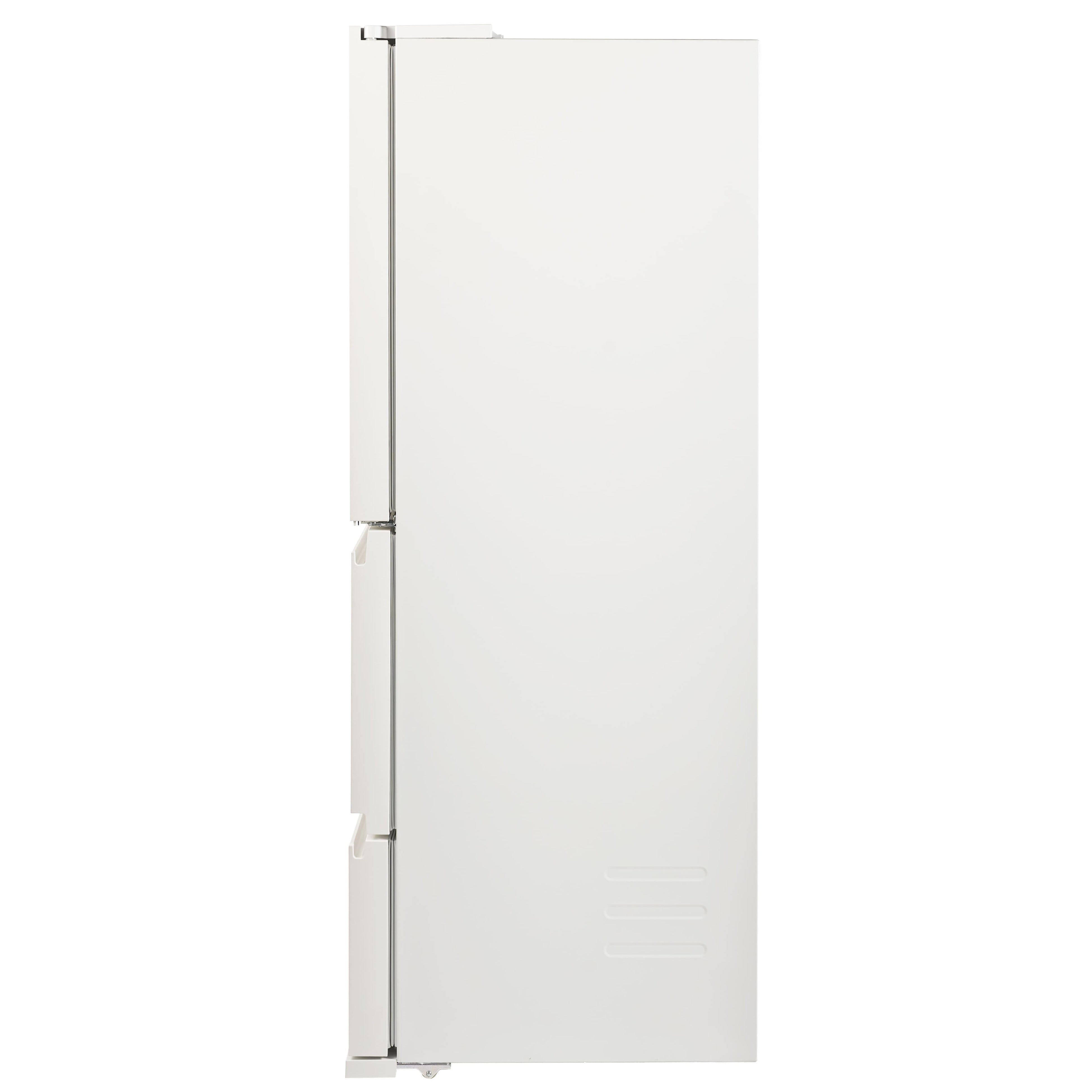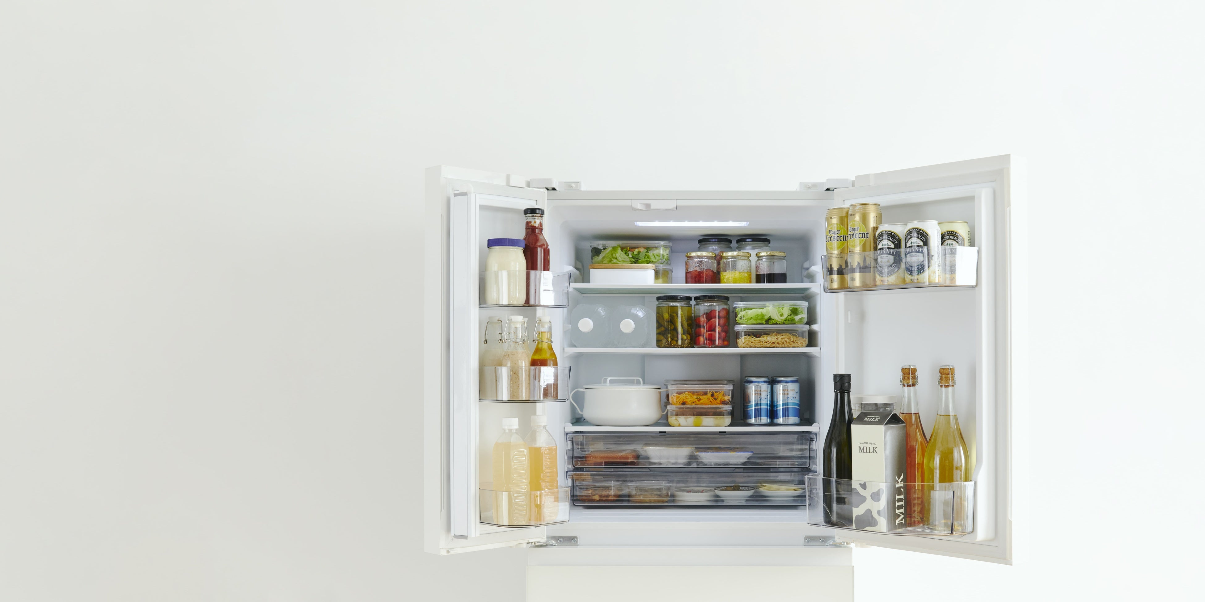 奥行きの薄さに加えて、両側に広く開くことができるフレンチドアで、ドアを大きく開けても省スペース。キッチンで料理するときも邪魔になりません。ドアポケットに入れたものまで、庫内を気持ちよく一望することができます。