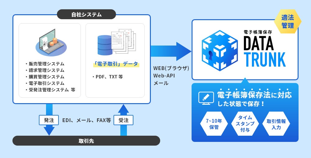 お客様が商取引でやり取りする国税関係の帳簿や書類などの帳票ファイルを「電子帳簿保存法」の「電子取引」「スキャナ保存」に対応した形式で保管するクラウドストレージです。保存方法はとても簡単。画面からのアップロードでもできますし、APIやメールで今お使いのシステムと連携させれば、自動的に適法化された状態で保存できます。また、弊社のFAXサービスと連携させれば、FAXペーパーレス化と適法化が同時に実現できます。