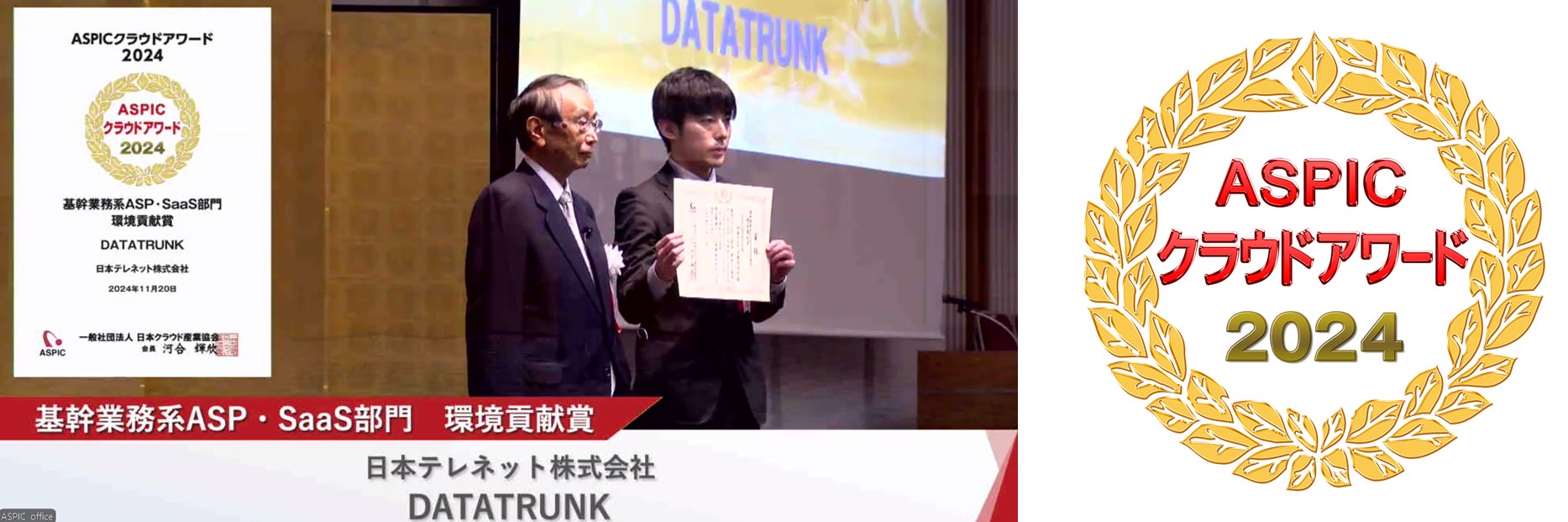 DATATRUNKが、2024年11月20日、一般社団法人日本クラウド産業協会より発表された「ASPIC クラウドアワード2024」の基幹業務系ASP・SaaS部門において環境貢献賞を受賞いたしました