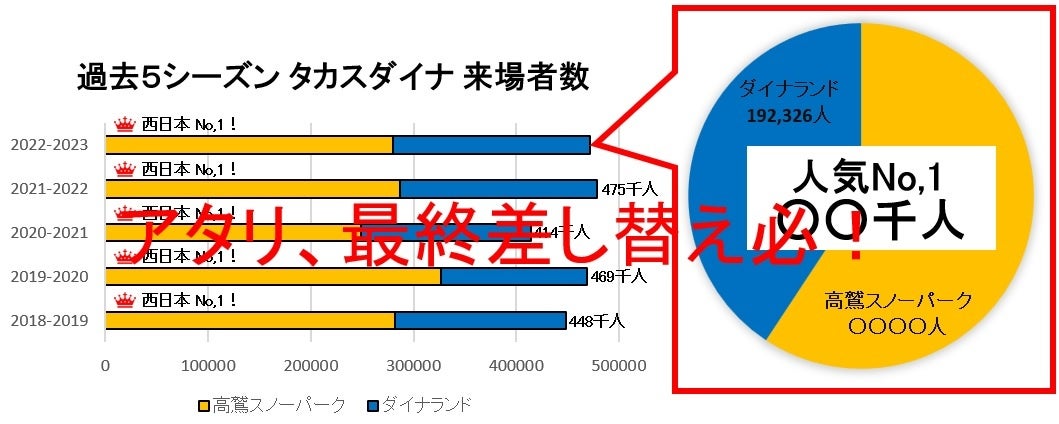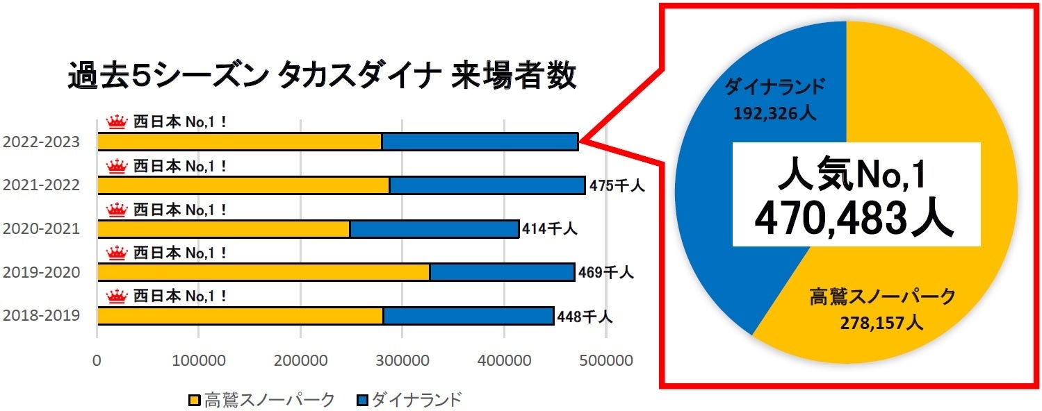2022-23シーズンは278千人のお客様をお迎えすることができ、6年連続、西日本最多の来場者数を達成いたしました。さらに、隣接するダイナランドと合わせると【タカスダイナ】で来場者数470千人を突破、西日本で圧倒的に支持されている人気No.1ゲレンデです。