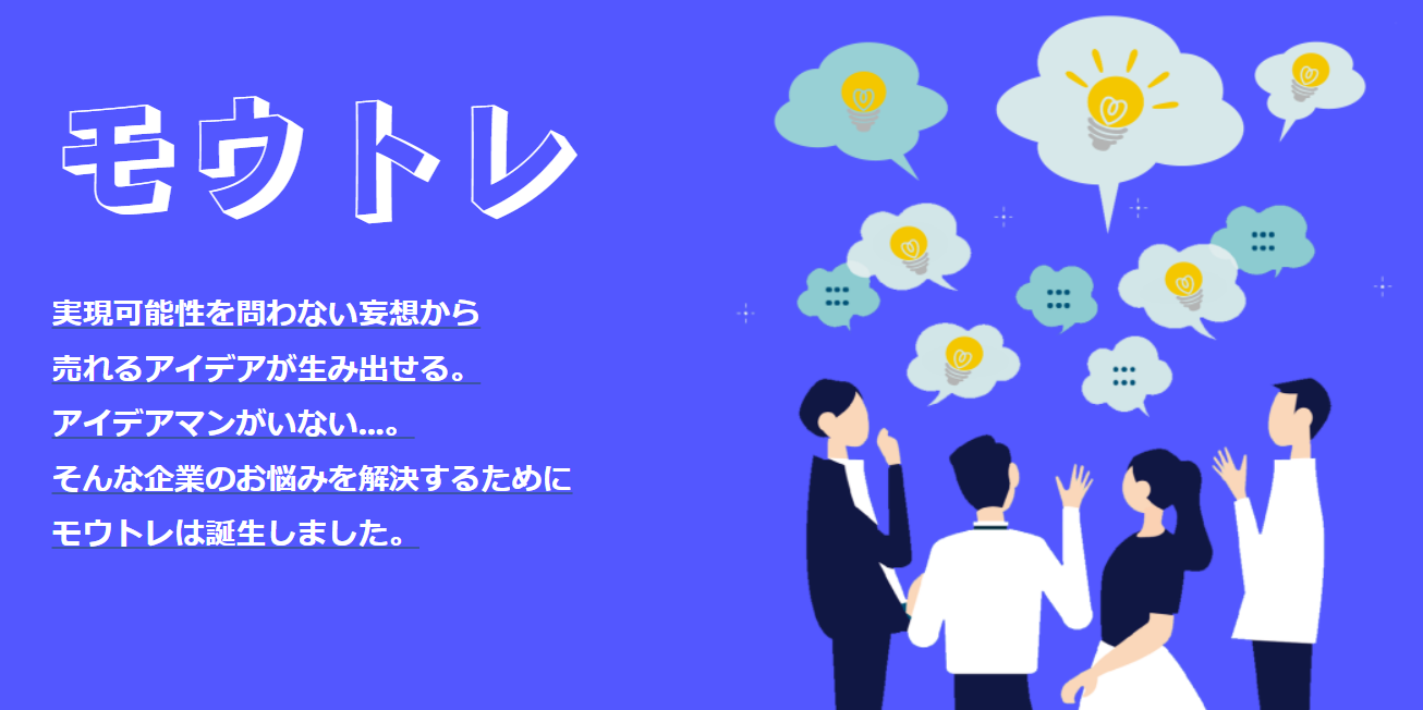 これまでは、個人向けサービスとして展開してきましたが、「アイデアがなかなか出ない…」という悩みを抱えている企業の皆様向けに、独自のアイデア発想法を学ぶことで、柔軟にアイデアが出せるようになるサービス【モウトレ】を4月25日にリリースしました。 1度、研修を受けていただくだけで、“いつでも” ”どこでも” アイデアを出せるようになり、商品開発や会議などビジネスの場ですぐに活かしていただくことが出来る、今までにないサービスです。
