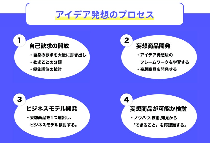 モウトレでは、独自の4つのアイデア発想のプロセスを学ぶことで、柔軟にアイデア発想ができるようになります!
