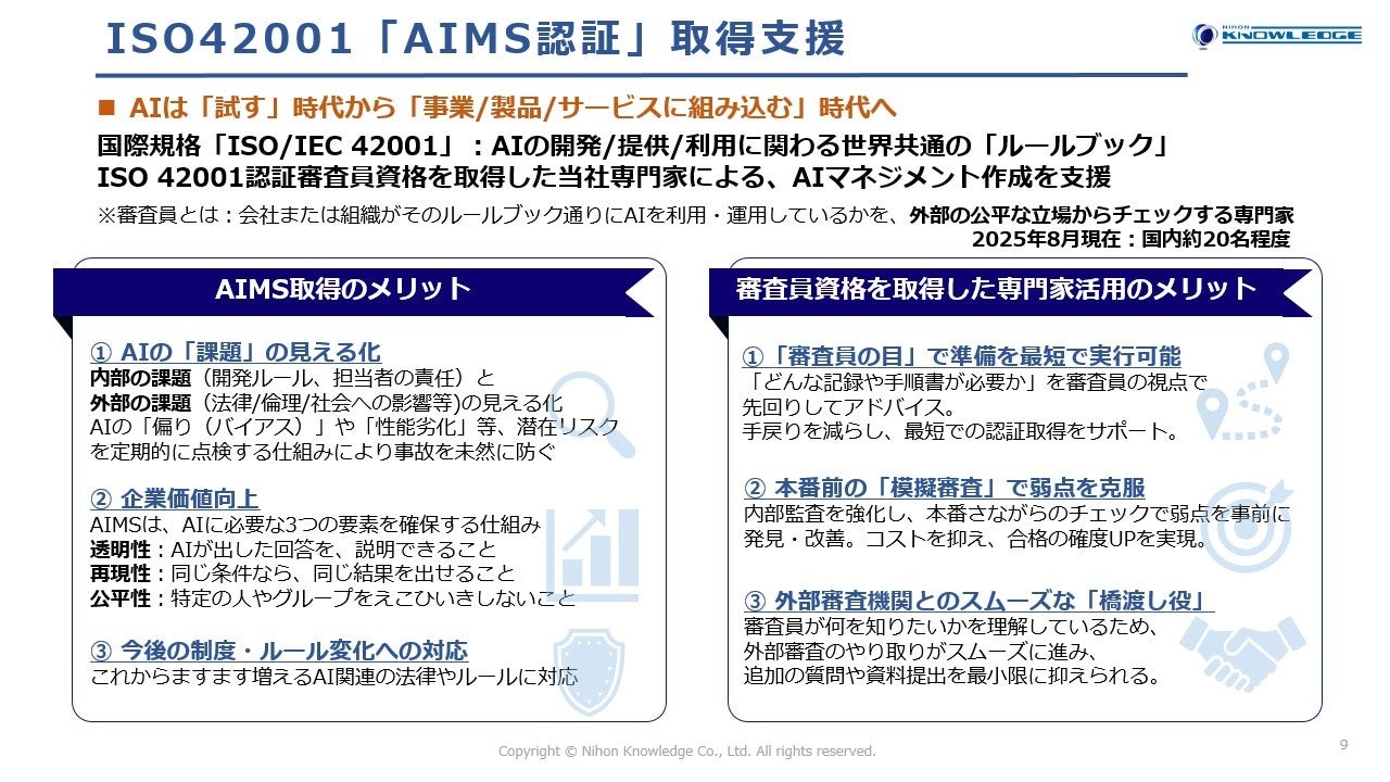 AIリスク管理およびAIシステム影響評価を踏まえ整合性の取れたAIマネジメントシステムからISO42001(AIMS)認証取得をサポートする、ワンストップサービスによる攻めのAI活用をご支援