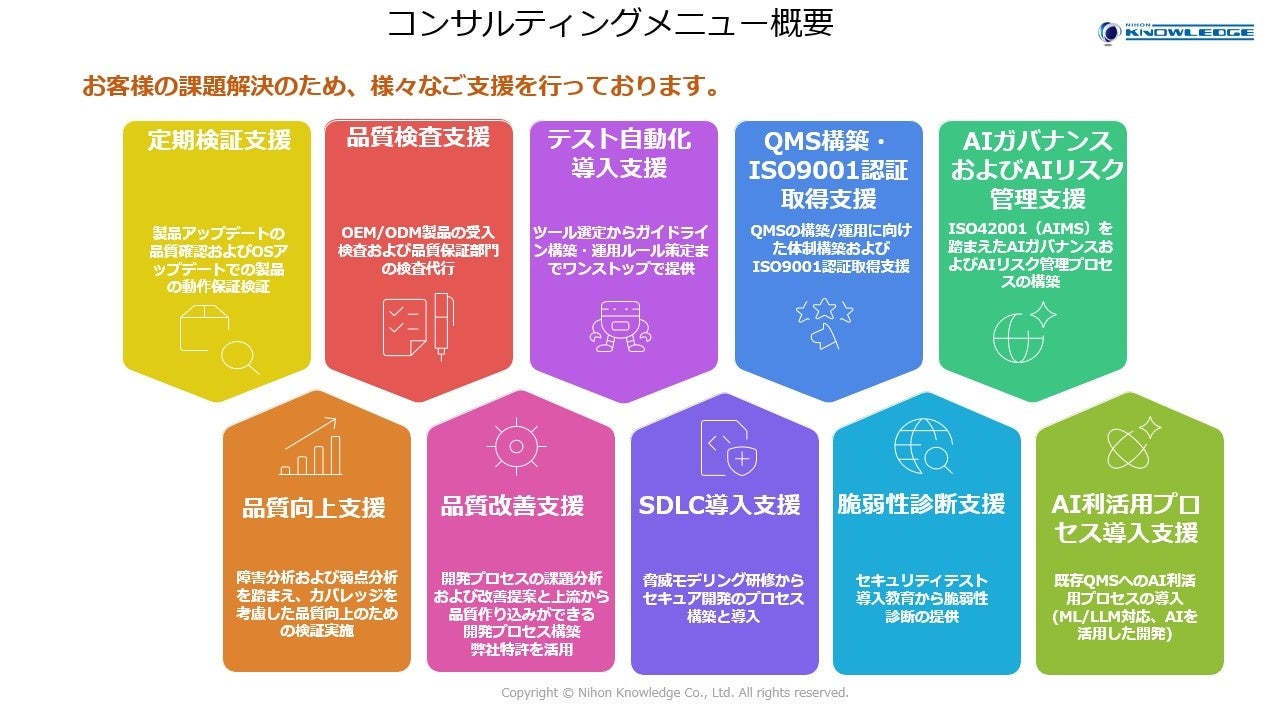 日本ナレッジ株式会社は、「人と技術を育み、安心できるデジタル社会の未来を支える」というミッションのもと、ソフトウェア検証・品質保証やテスト自動化を中心に、AI・セキュリティ開発、教育・研修サービスを展開しています。