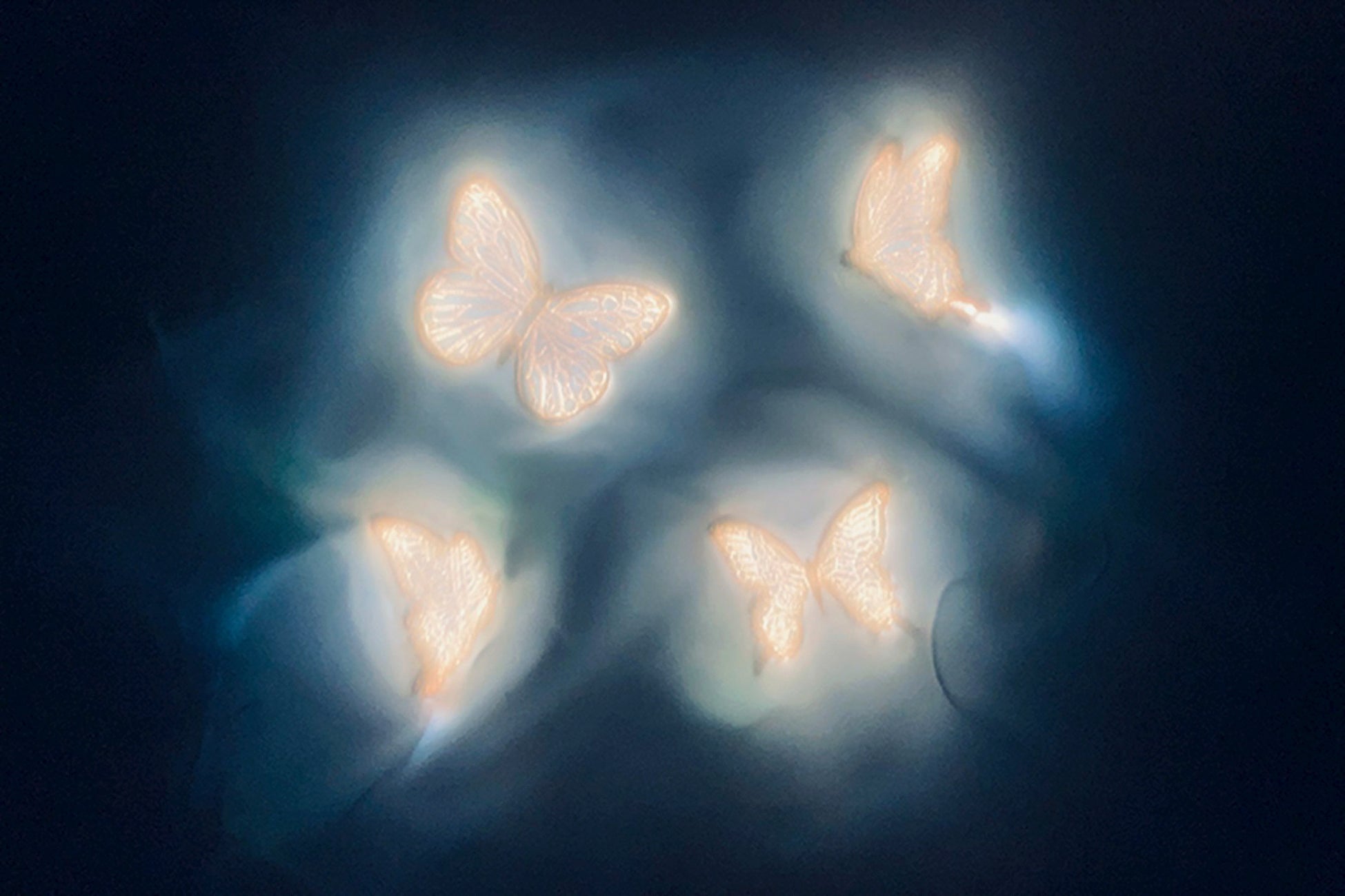 インスタレーションアートには、⼿で触れることによって刺繍が連鎖的に発光する技術を使用しています。同時に、刺繍で作られた立体の蝶たちが作品の前で羽ばたき、空間を演出します。