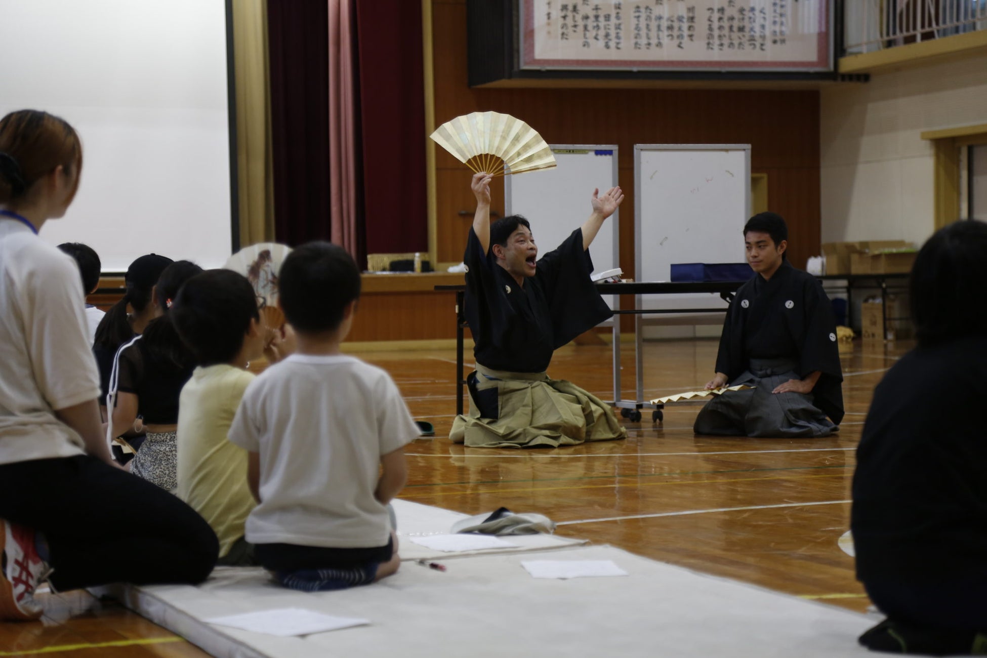 能楽師狂言方・和泉流野村派十四世当主の野村又三郎氏と、野村信朗氏をお迎えし、狂言の歴史や成り立ちについて解説していただきました。続いて、演目の一節を実演していただくと、独特の節回しや間合いに児童たちは目を丸くして見入っていました。ワークショップでは、扇を使って甘酒を注ぐ所作に挑戦し、日本の伝統芸能に実際に触れる貴重な時間となりました。