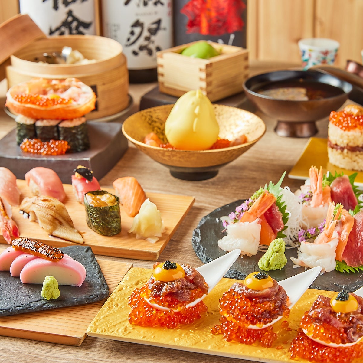 アゴ出汁⼭葵稲荷 、鯵と梅⾁のあて巻き、数の⼦⼭葵のあて巻き、柚⼦胡椒鯛のあて巻き