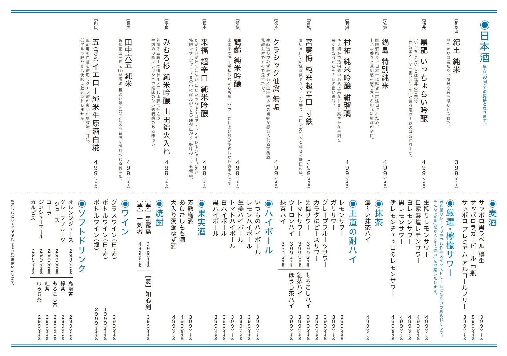 ハイボール・チューハイ、何杯飲んでも1杯190円(税込209円)