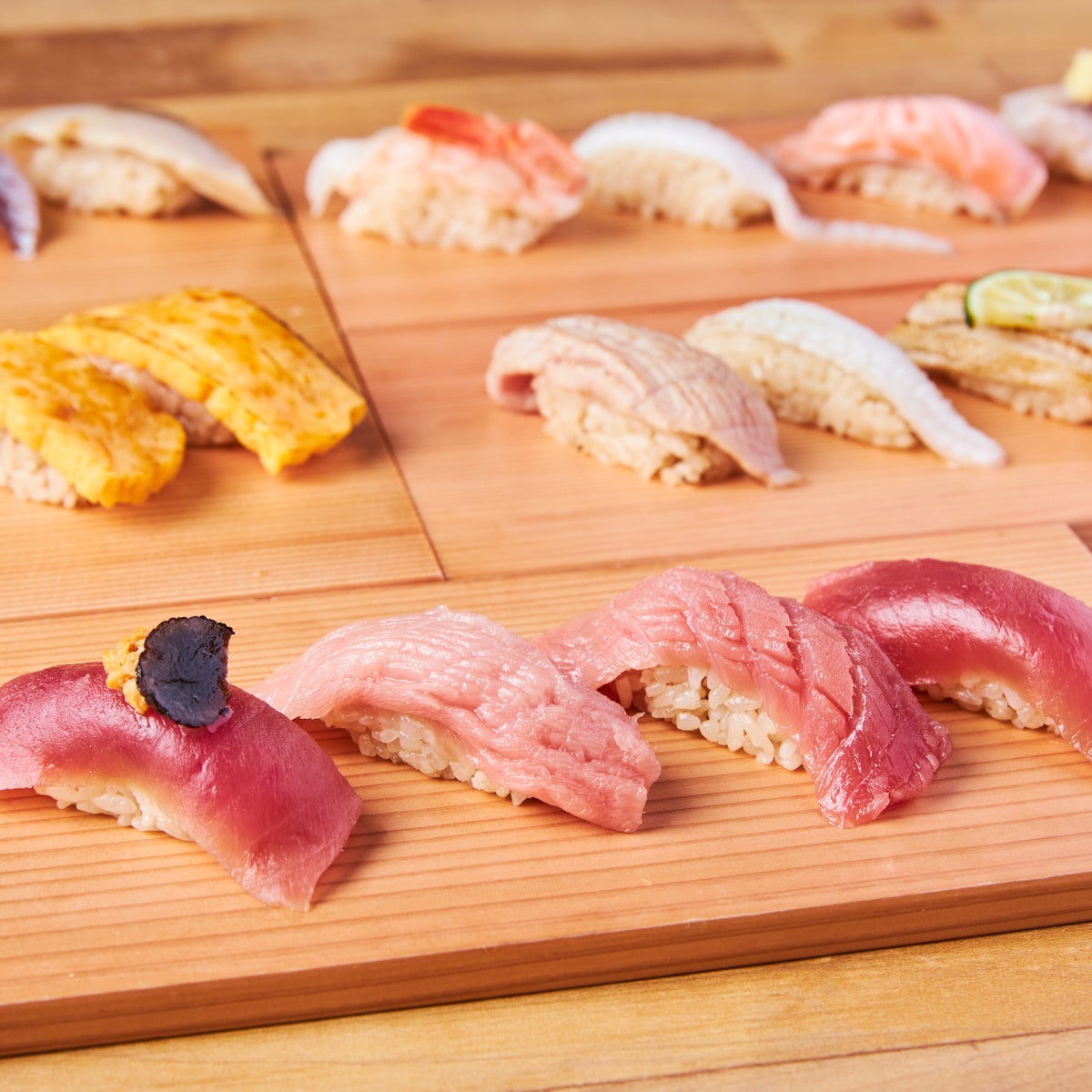 遡ること江⼾時代、「なれずし」から始まった寿司は、上⽅から江⼾に⼊って花開き、握りずしが⼤成した。