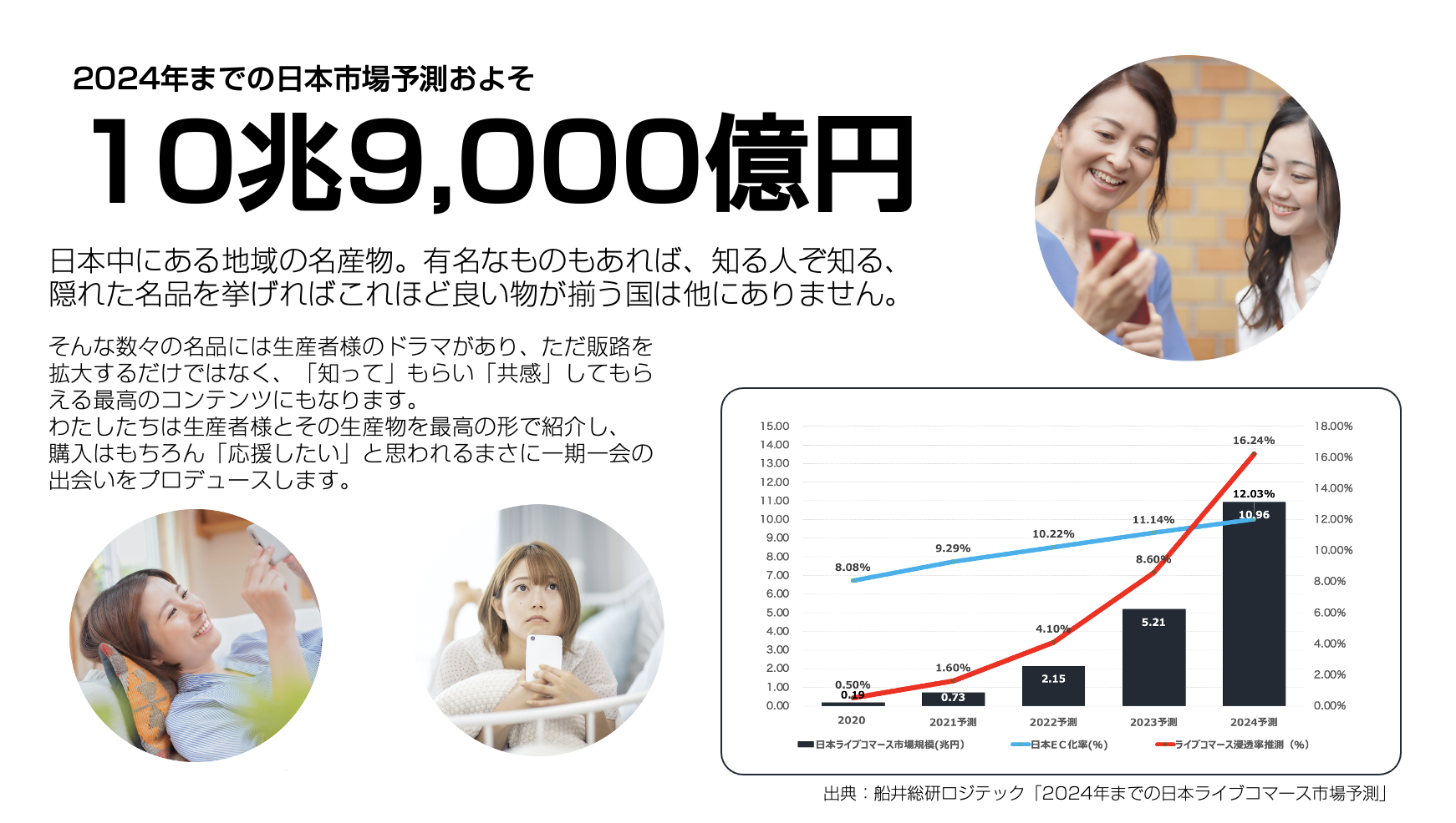 今後のライブコマース市場は2024年までに10兆円規模の拡大が見込まれており、今からライブコマースを導入することで先行利益が得られる可能性も期待できます。