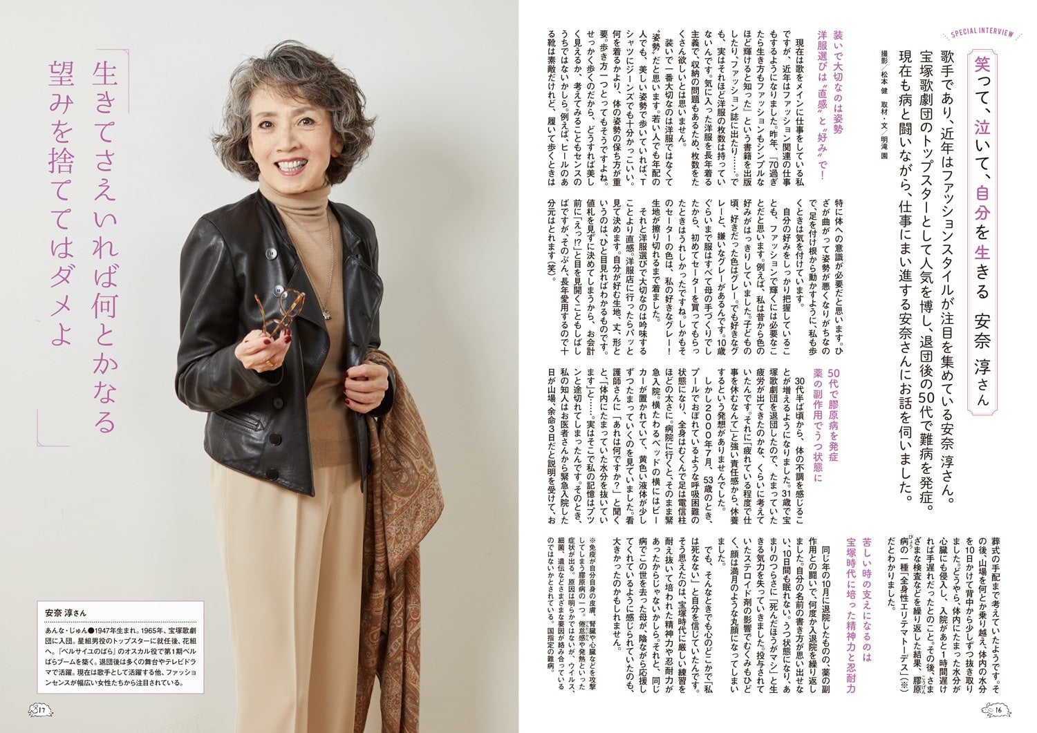 あんな・じゅん● 1965年、宝塚歌劇団に入団。星組男役のトップスターに就任後、花組へ。『ベルサイユのばら』のオスカル役で第1期ベルばらブームを築く。退団後は多くの舞台やテレビドラマで活躍。現在は歌手として活躍する他、ファッションセンスが幅広い女性たちから注目されている。