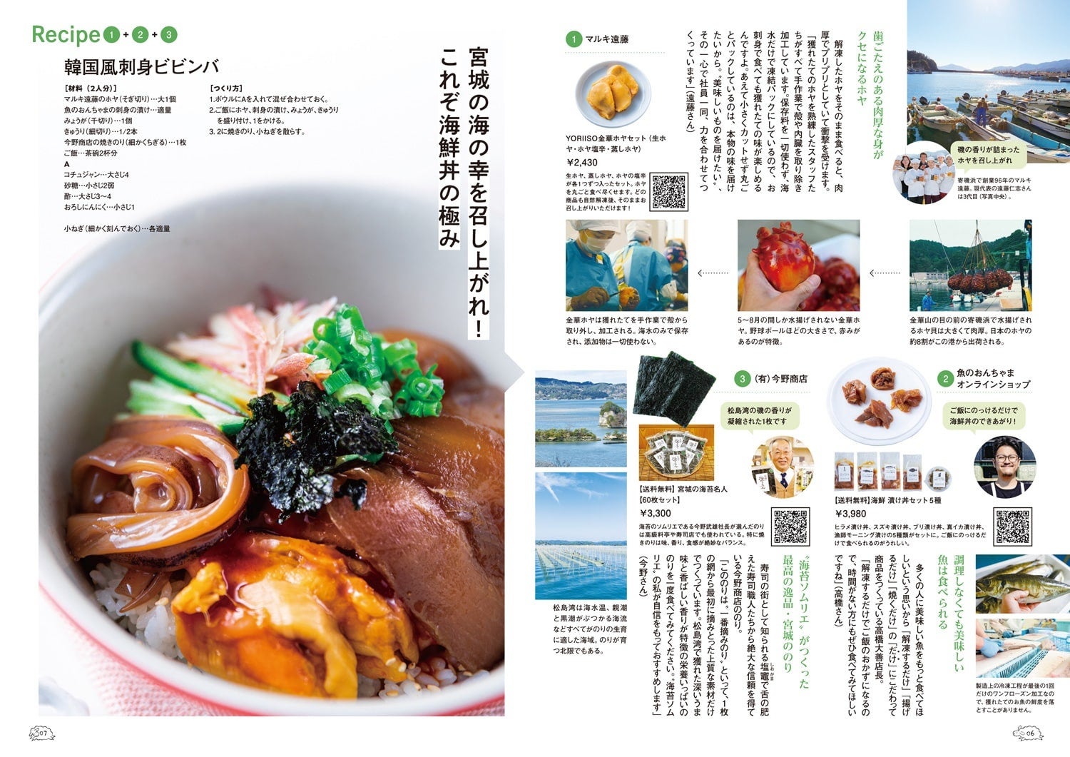この時期、海の幸も山の幸も美味しいのが宮城!家庭で簡単につくることができるレシピとともに、『めりぃさんのお店』でお取り寄せできる産直品をご紹介します。石巻市の寄磯浜で獲れたホヤ(マルキ遠藤)、塩竃市の“海苔ソムリエ”が厳選した海苔(今野商店)などを使い、フードスタイリスト・八代恵美子さんのオリジナルレシピ「韓国風刺身ビビンバ」をご紹介。ほかにも、塩竃の塩とイカで作った「塩辛」(平塚商店)を隠し味に使った「牛たんと塩辛の極うまカレー」、山元町のミニトマト・フルティカ(大栄ファーム)、白石市の温麺(きちみ製麺)で作った「ガスパチョ温麺」のレシピを掲載しています。
