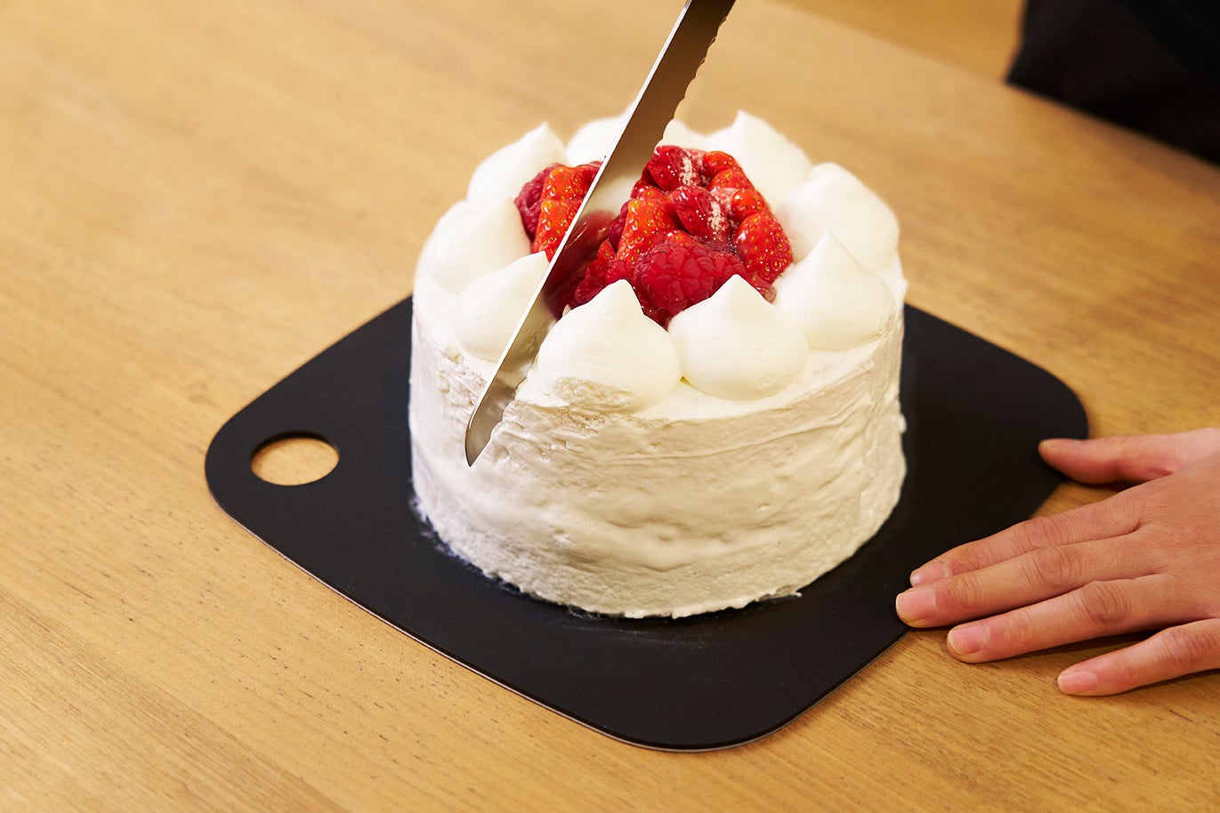 一辺25cm。狭いスペースでも回して使え、みじん切りや複数の食材を1つの面で切るのに便利です。45度回転させると幅が約30cmになるので、食材のサイズに合わせて使い分けが可能です。また、ケーキなど円形のものもはみ出さずに置けて、そのままカットできます。