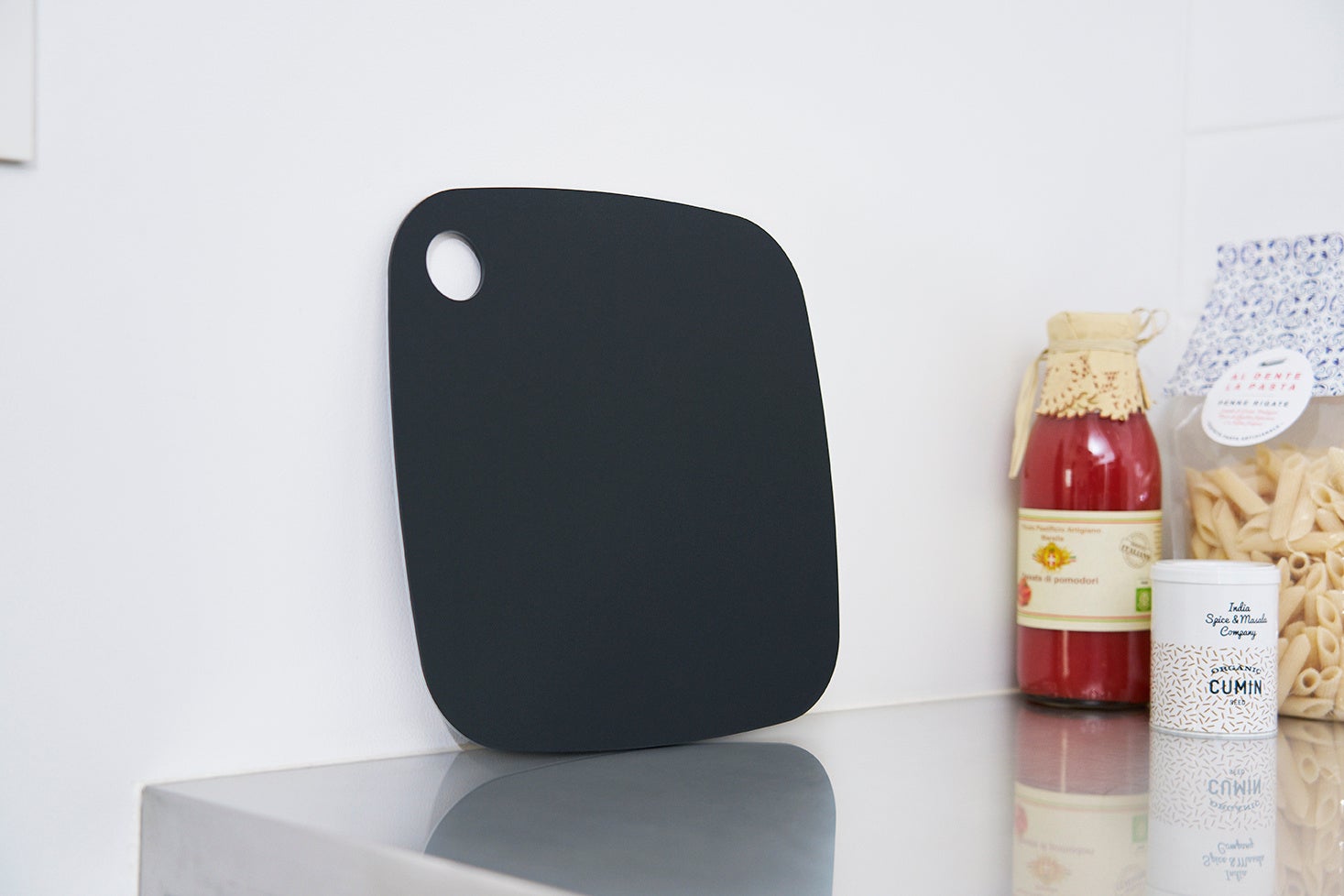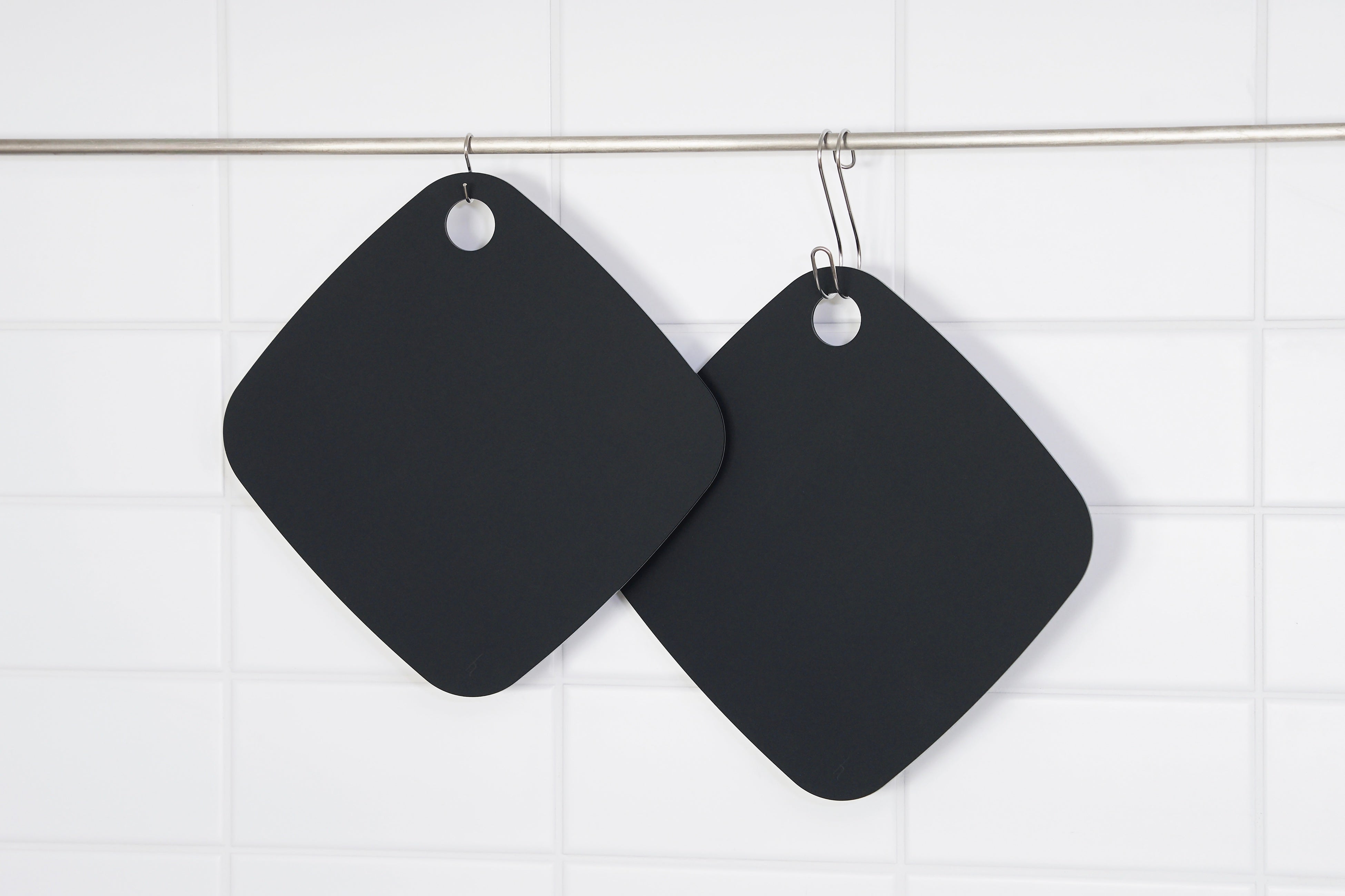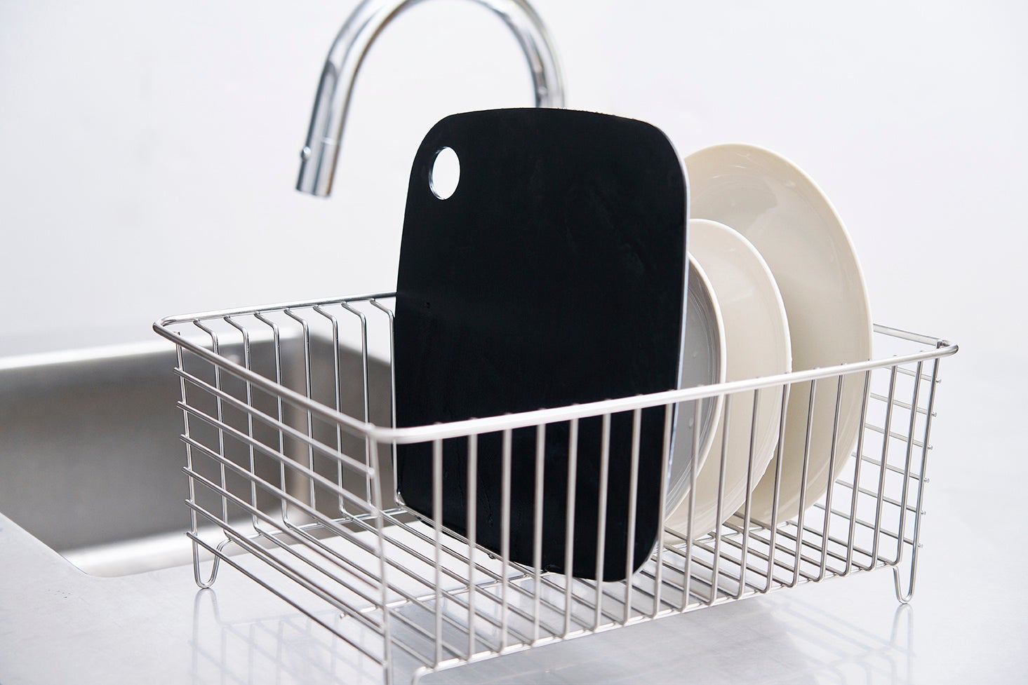 ゆるやかな曲線形状で接地面が少なく、立てかけた際に水切れが良く風通しも良いのが特徴です。また、直径3cmの穴が空いているため、様々なサイズのフックに対応します。立てかけたり吊るしたり、キッチンの目に留まる場所にあっても、インテリアになじむ形状と落ち着いた色です。