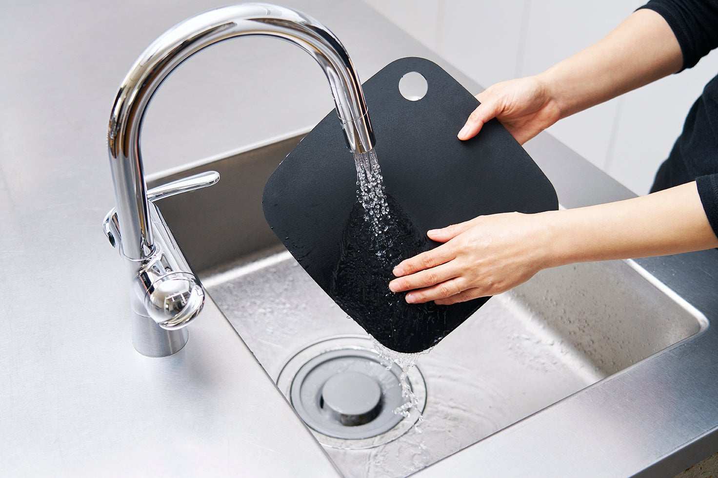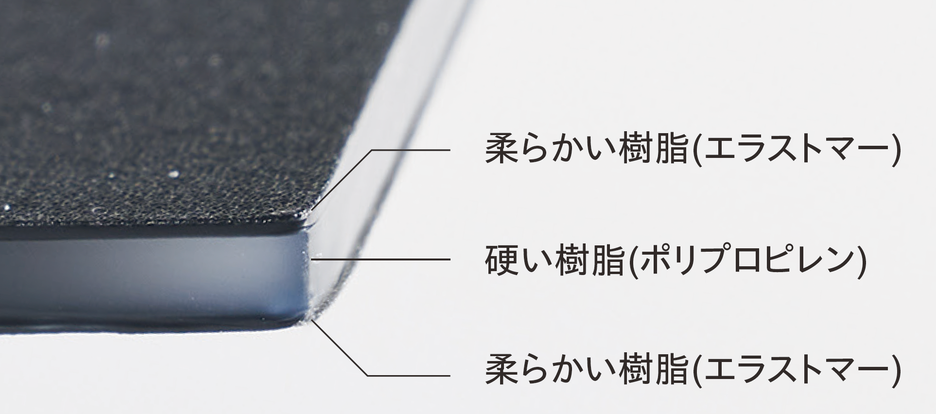 硬い樹脂を柔らかい樹脂で挟んだ特殊な3層構造は、刃あたりの良い3mm厚。柔らかい樹脂に刃があたるので包丁が長持ちします。また、裏表どちらも使用可能です。素材には抗菌剤を練り込んでいるため、衛生的で安心です。