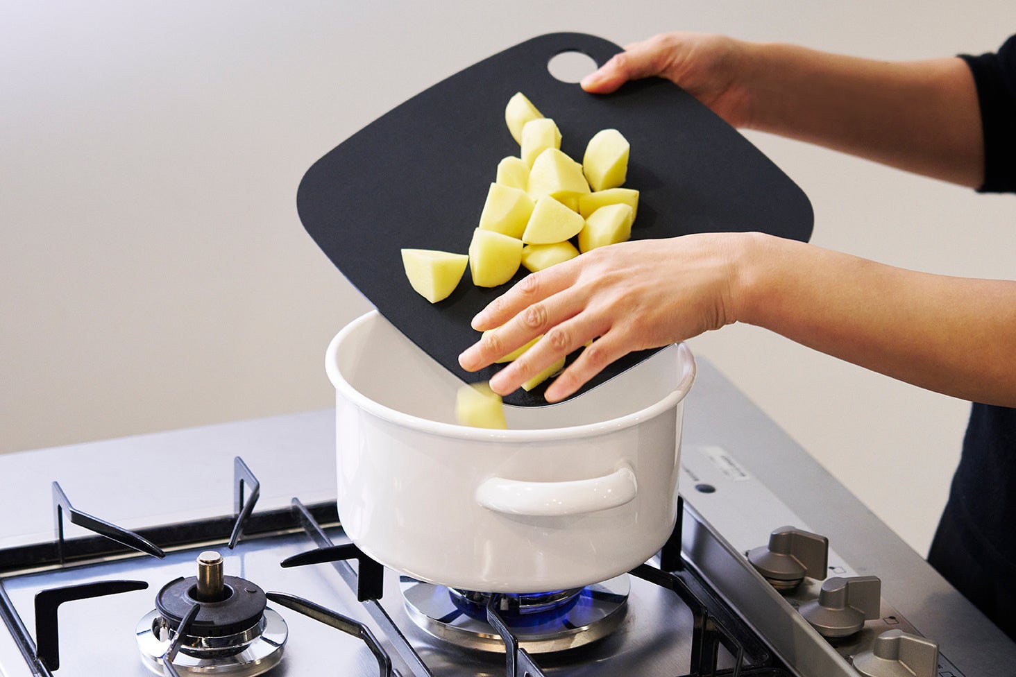 約150gの軽さと片手で扱いやすいサイズで、切った食材を鍋やボウルへスムースに移すことができます。また、回しながら洗え、お皿と一緒に水切りかごにすっきり収まります。