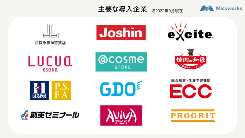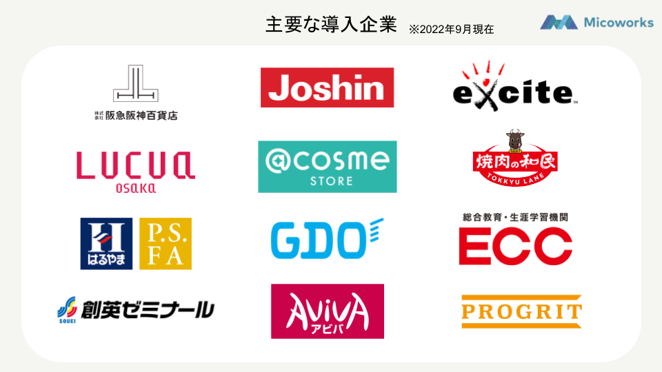 当社は、2019年2月より企業の顧客を見える化し、集客を最大化するマーケティングSaaS「MicoCloud」を提供しています。2022年8月末時点で導入企業は約500社、導入アカウント数は750を突破し、数多くの企業で活用いただいています。BtoC事業を展開する企業を中心に、美容サロンや学習塾、百貨店や小売業、人材紹介業や不動産業など、顧客との継続的なコミュニケーションを求める幅広い業種での導入実績があります。2022年2月のシリーズA初回資金調達以降、「MicoCloud」のさらなる事業拡大に向けて、CxOクラスの人材採用や各部署の人員拡充、開発体制の強化を行い、100名規模の組織へと成長を遂げました。また、サービス提供価値向上のため、カスタマーサクセス体制の整備と質の向上を図り、直近3ヶ月のサービス継続利用率は99.5%(2022年7月末時点)を実現しています。