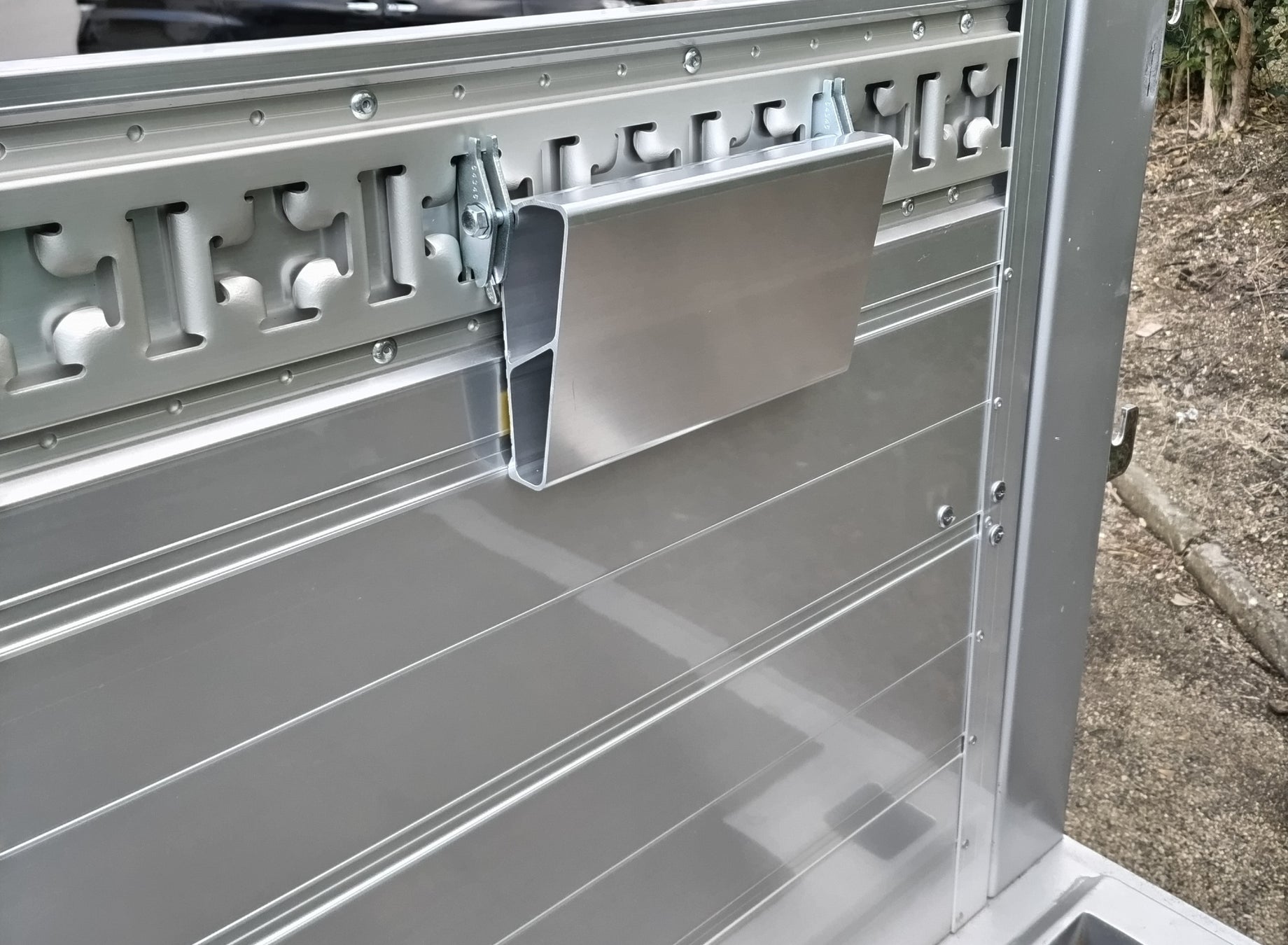 荷台あおりのラッシングレールに加工を行わずに簡単に固定、取り外しが可能です。