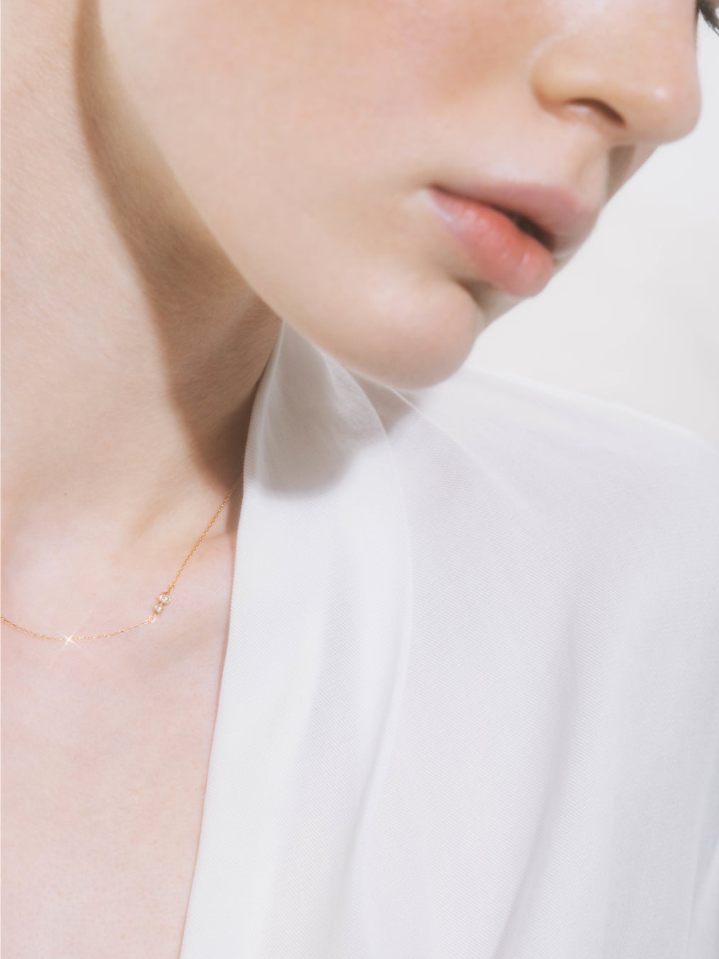 それぞれ地金で丸く囲むことで、角のとれたやわらかい光を放つのが特徴。肌に溶け込むような繊細なチェーンと、鎖骨の中央に乗る3つのダイヤモンド。