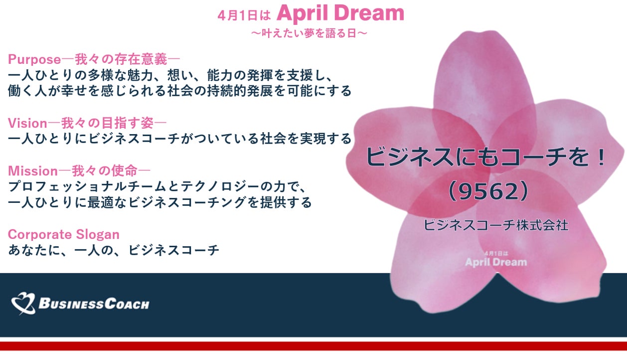 また、PRタイムズ社が主催する「April Dream(エイプリルドリーム)=叶えたい夢を語る日」に賛同し、『ビジネスにもコーチを!(9562)※』というフレーズをビジネスコーチ社が叶えたい夢として、本イベントに寄せました。