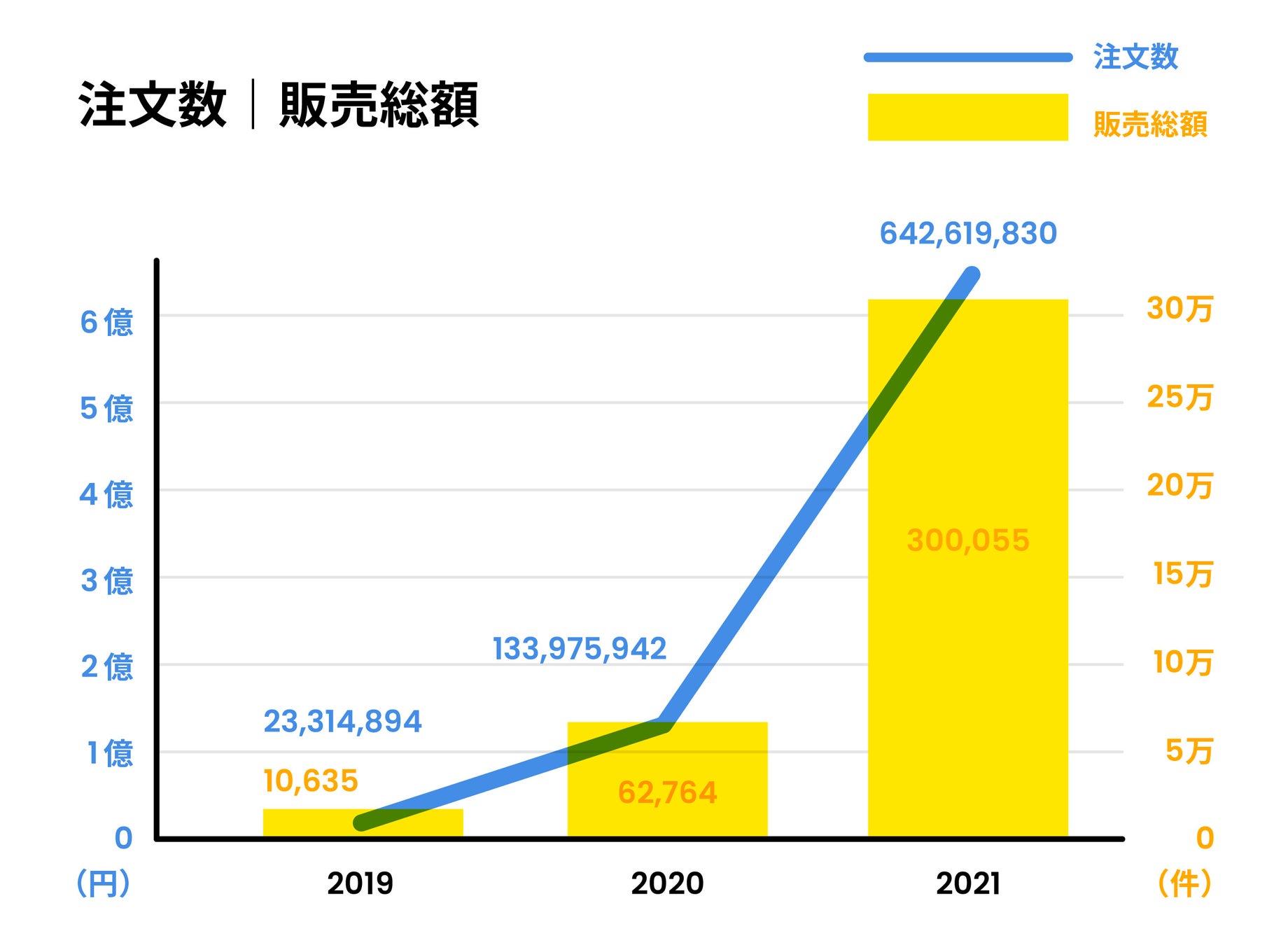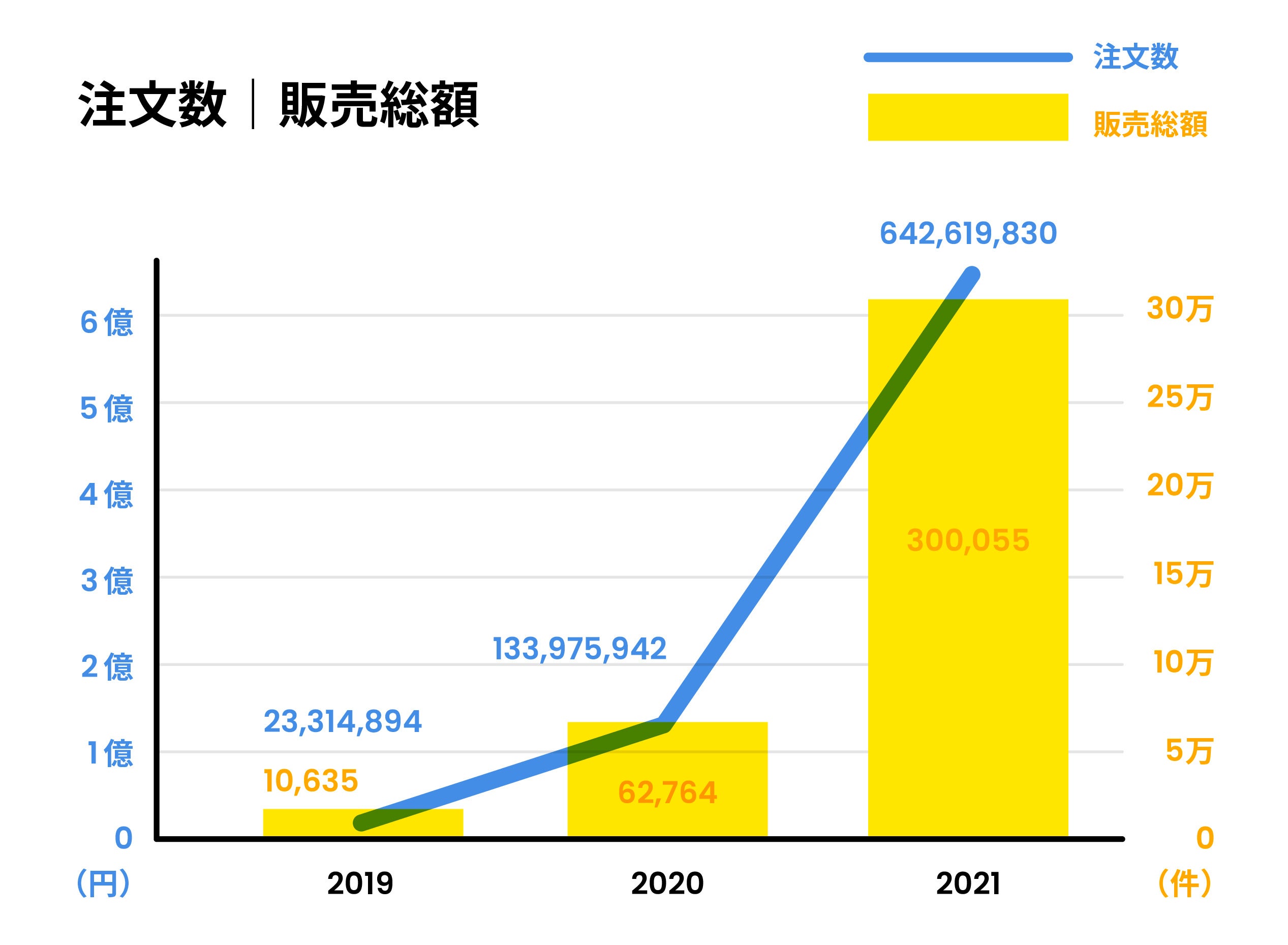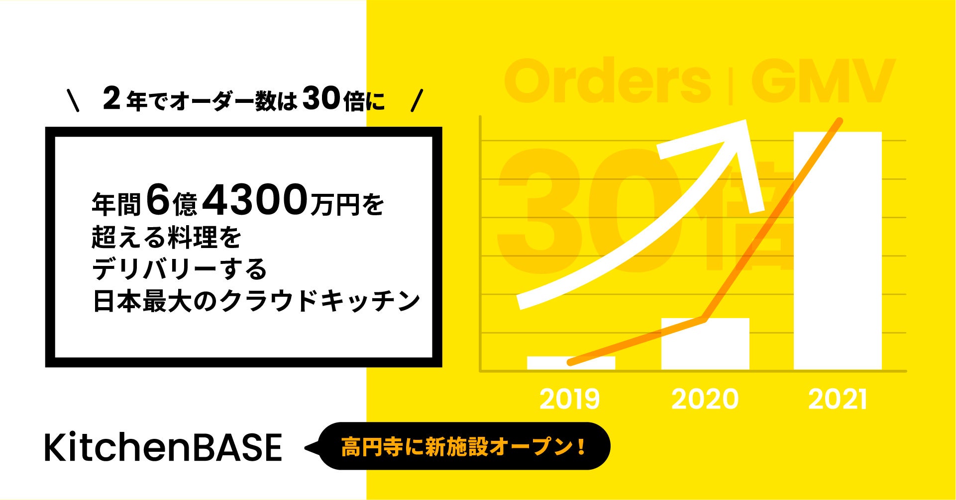 食事をデリバリーで頼むという選択肢が一般的になり、街中でUberEatsなどのリュックを持った人を見かけることも多くなりました。KitchenBASEは2019年6月に客席のないクラウドキッチンを開始。今では東京に6施設(中目黒・神楽坂・浅草・中野・蔵前・高円寺)、大阪に1施設を設けています。2年で施設全体のオーダー数は約30倍の30万オーダー超え、ご注文いただいた料理は年間で約6億4300万円と急激な成長を遂げています。