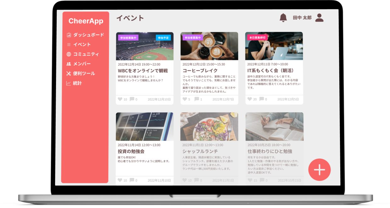 CheerAppは従業員間の業務を超えた縦横斜めのコミュニケーションが生まれる場を作り、運営することができる社内コミュニティ専用のプラットフォームです。