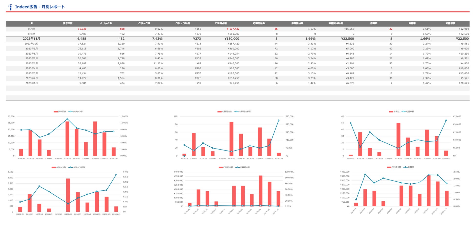 弊社では、以前からIndeed広告に特化したLooker Studioレポートテンプレートをご提供しておりましたが、今回新たに「Excel」でご利用いただけるテンプレートを追加いたしました。